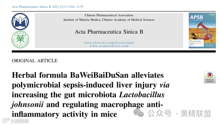 中药复方八味败毒散(BWBDS)是医院处方,临床上能有效治疗术后感染,其是从八种传统中药(人参、百合、黄精、金银花、沙棘、杏仁、桔梗和柏皮)提取的有效成分,具有抗菌、抗炎等多种生理活性。网络药理学表明,这些活性机制可能影响细菌生化反应和炎症调节。然而,BWBDS在多微生物脓毒症中的治疗潜力尚不清楚。为探讨BWBDS治疗脓毒症的潜力,并探讨其与肝肠之间相关的机制,澳门大学健康科学院梁丽娴教授、广州中医药大学第二附属医院(广东省中医院)中医湿证国家重点实验室谢莹教授和北京中医药大学信息中心陈建新教授课题组在《Acta Pharmaceutica Sinica B》(JCR 1区 IF14.5)联合发表了“Herbal formula BaWeiBaiDuSan alleviates polymicrobial sepsis-induced liver injury via increasing the gut microbiota Lactobacillus johnsonii and regulating macrophage anti-inflammatory activity in mice”的研究论文。