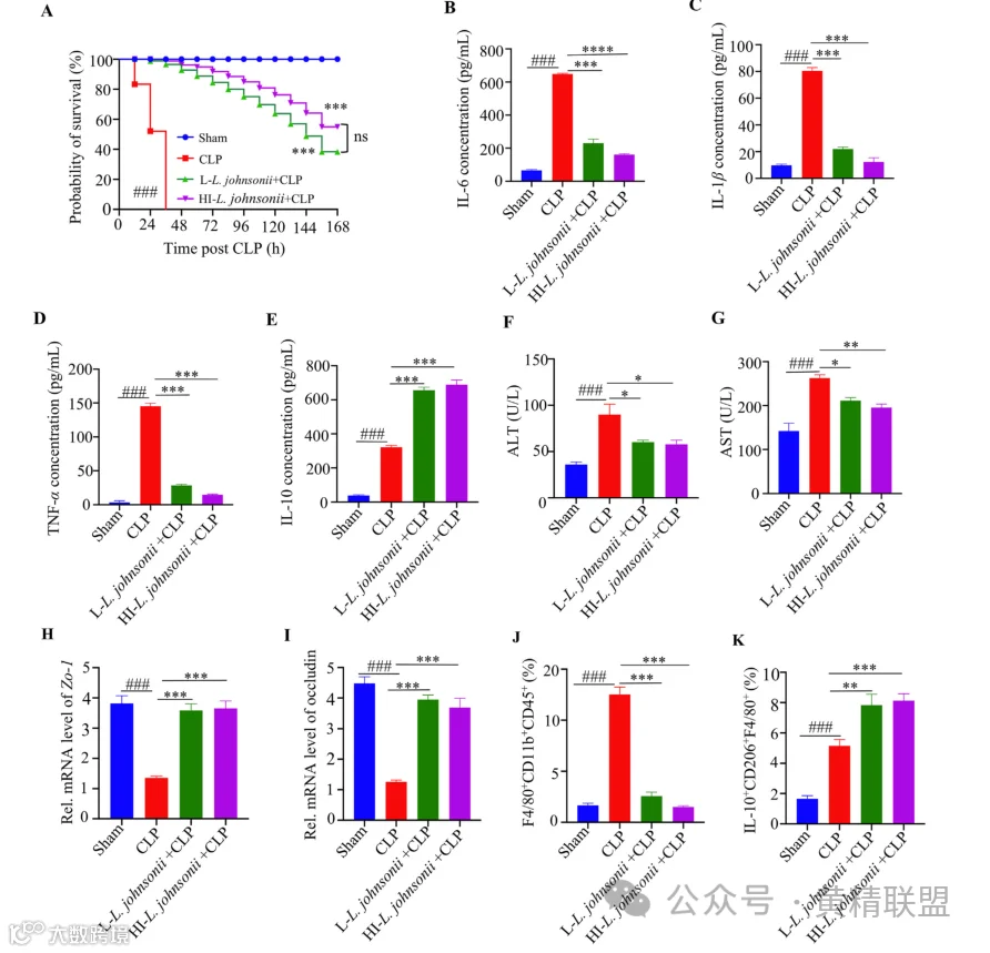 本研究还发现与对照组相比,约氏乳杆菌治疗显著增加了IL-10+ M2巨噬细胞的比例(图8A);显著提高结肠IL-10 mRNA和血清中IL-10蛋白的水平(图7B和C)。而约氏乳杆菌联合IL-10抗体阻断剂治疗组与对照组无明显变化(图7D),肝内总巨噬细胞比例未见下降(图7E)。这些结果表明,约氏乳杆菌治疗小鼠SILI可能部分依赖于IL-10+ M2巨噬细胞的促进。为了进一步阐明约氏乳杆菌的治疗机制,本研究还比较了活的和死的约氏乳杆菌对脓毒症的治疗效果。发现口服正常和灭活的约氏乳杆菌都显著延长了小鼠CLP后的存活率,且失活的比正常的活性好(图8A)。此外,灭活的约氏乳杆菌治疗组血清中促炎因子水平明显降低,抗炎因子水平明显上调(图8B-E);谷丙转氨酶(ALT)和谷草转氨酶(AST)水平降低(图8F和G);肝脏中巨噬细胞总比例降低,IL-10+ M2增加(图8J和K)。结果表明灭活的约氏乳杆菌的细胞膜成分对SILI也有有益作用,猜测可能其细胞膜成分是影响巨噬细胞的抗炎功能的主要成分。