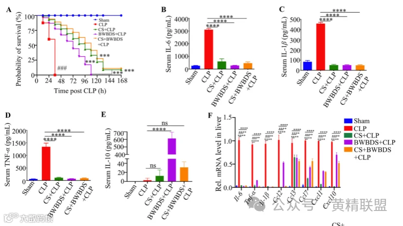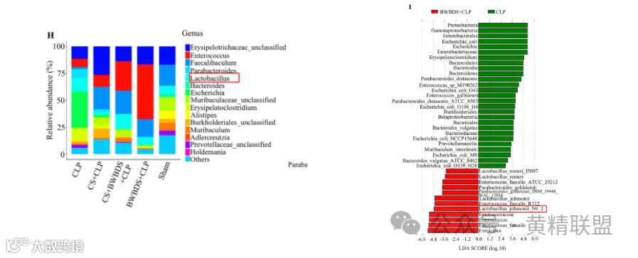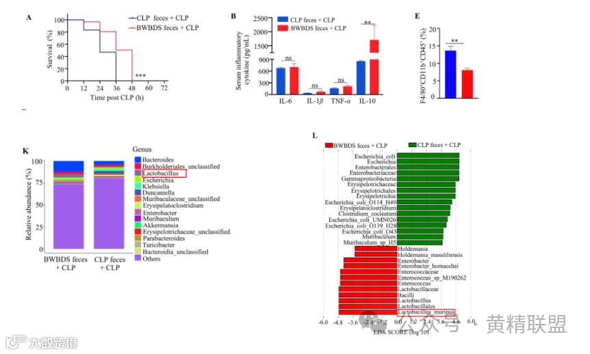 首先该研究通过网络药理学预测了与BWBDS抗脓毒症作用相关通路。尤其是一些重要的炎症因子和信号的通路如肿瘤坏死因子(TNF)和白介素-17(IL-17)等。本实验发现与盲肠结扎穿刺(CLP)对照组小鼠相比,BWBDS治疗组小鼠的生存时间显著延长(图1A);血清中促炎细胞因子及mRNA显著下调,抗炎细胞因子及mRNA显著上调(图1B-F);总巨噬细胞和M1巨噬细胞减少,同时M2巨噬细胞增加(图2A-C)。本实验还发现与CLP对照小鼠相比,肠道菌群中约氏乳酸杆菌丰度均有所增加(图3H和I)。以上结果表明BWBDS对小鼠SILI有治疗效果,并且其可能通过激活M2巨噬细胞和抑制M1巨噬细胞的功能及增加益生菌,减少有害菌来促进其治疗。