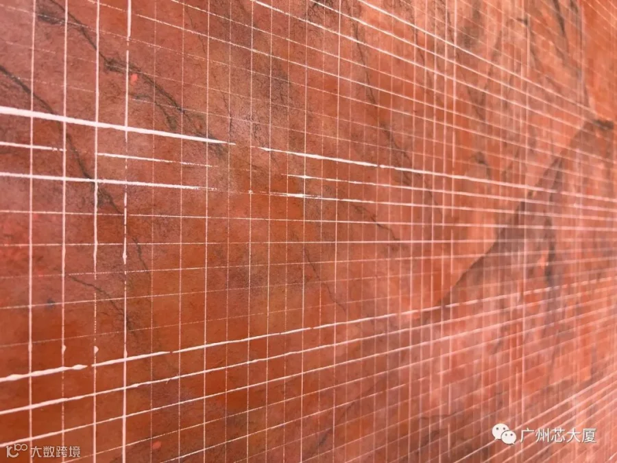 《赤壤接天》由广东省美术馆馆长王绍强老师创作,它远看似LED大屏幕,实则纸本水墨的水墨画。画中以独特的“撞水”手法展现层叠高山,艺术家更以自身独特的风格为整个画面赋予了方格线。