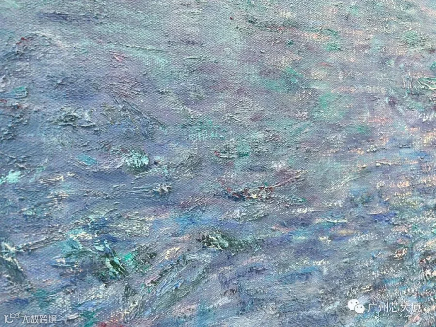 佛教说,有无相生,于无界中找边界,于边界处遁入无界。在游东醌老师的布面油画《大道无界》,菩萨身上的服饰飘带将画面分割成了两个视域,而飘带本隐而不现,遁于无形。被打破的界限,延伸出含蓄和耐人寻味的意境:你中有我,我中有你,大道无形,万物无界。