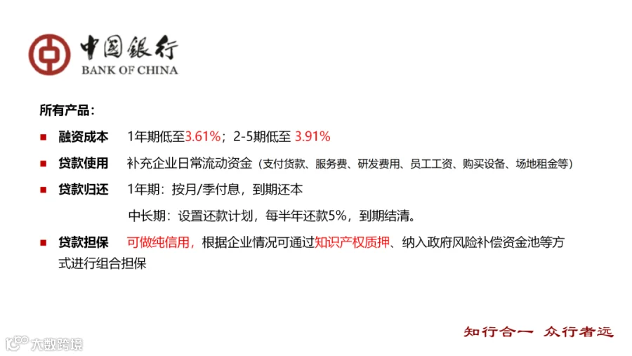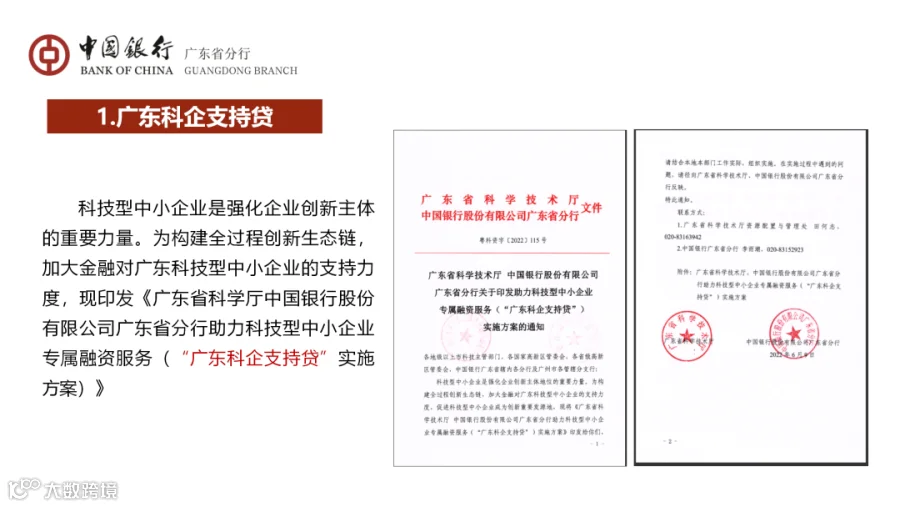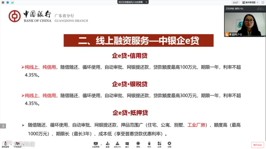 豆经理通过相关图文对《中国银行广州开发区分行融资服务方案介绍》进行分享。她讲解了科创企业融资服务及线上融资服务——中银企e贷两部分内容。