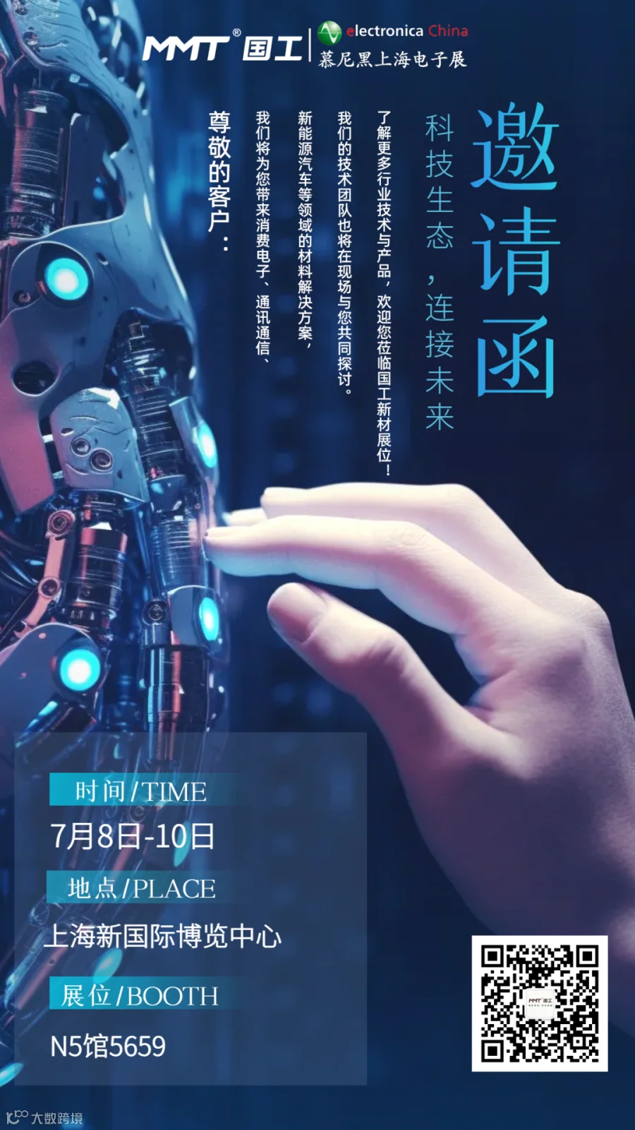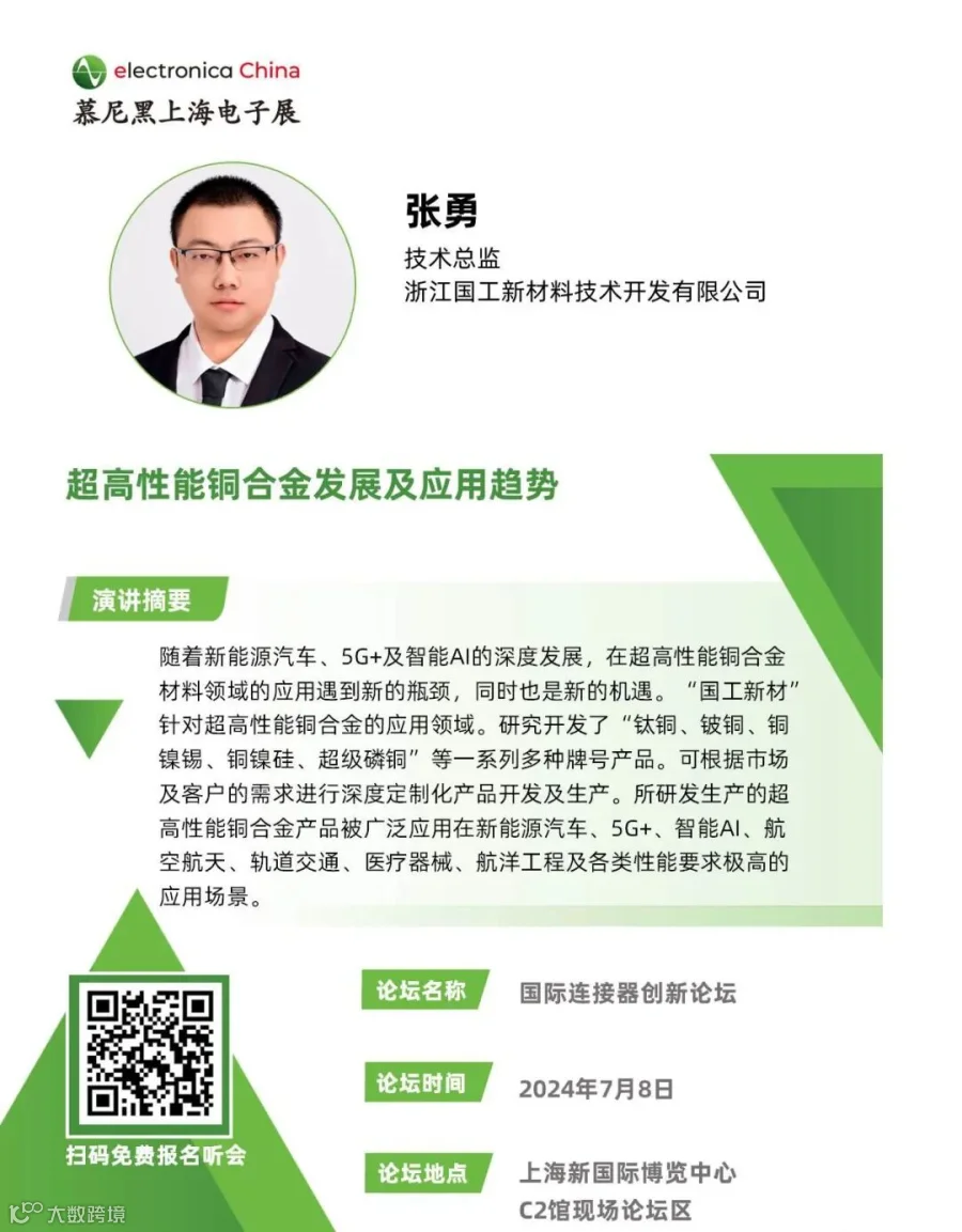 7月8日-10日,国工新材将携新能源汽车、消费电子、通信通讯所使用的超高性能铜合金材料,前往慕尼黑上海电子展 N5馆 5659号展位,特此诚邀行业伙伴前来参观,共同探讨新能源汽车、消费电子、5G通讯等领域的材料发展趋势。此外,在“国际连接器创新论坛”,国工新材将带来超高性能铜合金发展及应用趋势的精彩分享。
