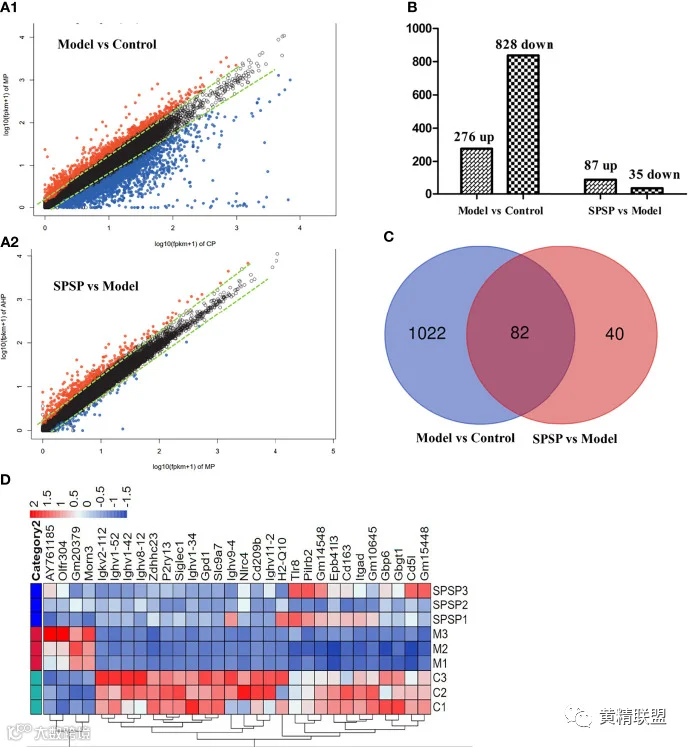 图6 DEGs分析。(A1)模型(M)组与对照(C)组DEGs的火山图;(A2) SPSP与模型组DEGs的火山图;(B)上调和下调DEGs数量;(C) M与C中DEGs的韦恩图以及SPSP与M组的比较;(D) DEGs的层次聚类