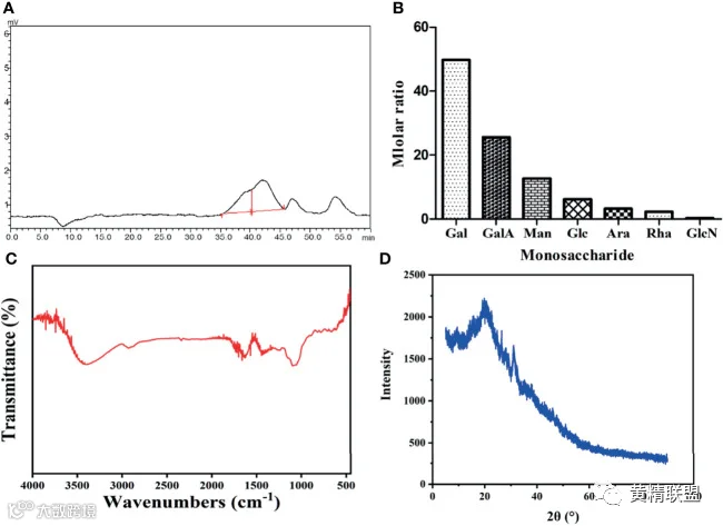 permeation chromatography, HPGPC)分析;(B) SPSP的单糖组成;(C) FT-IR光谱;(D) SPSP切片的X射线衍射(X-Ray Diffraction, XRD)光谱