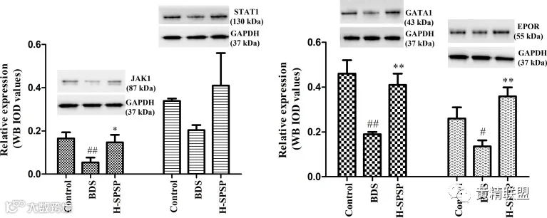 图9 H-SPSP对BDS小鼠Jak1、Stat1、EPOR和GATA1蛋白表达水平的影响。