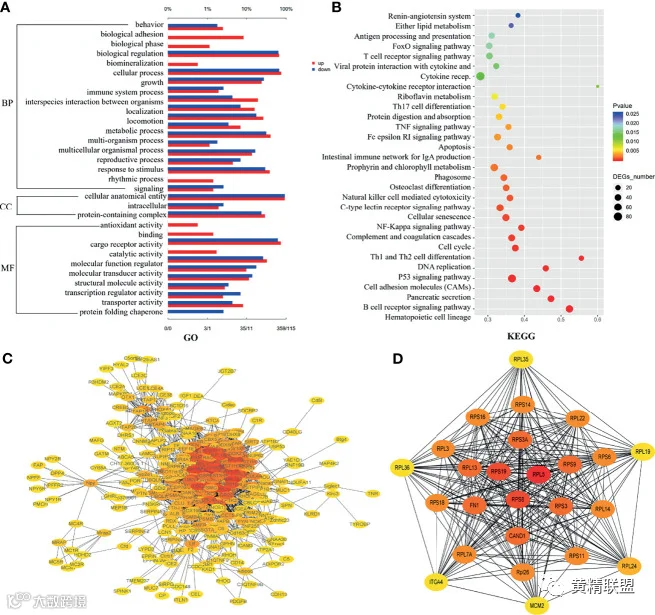 图7 DEGs的功能分析。(A) 生物途径(biological process, BP)、细胞成分(cellular component, CC)和分子功能(molecular functions, MF)上的Go富集序列;(B) KEGG富集序列;(C) 蛋白质-蛋白质相互作用(protein-protein interaction, PPI)网络;(D) PPI网络的子集。根据程度水平选择前25个DEGs进行放大。节点颜色由黄色变为红色,相应程度逐渐变大。
