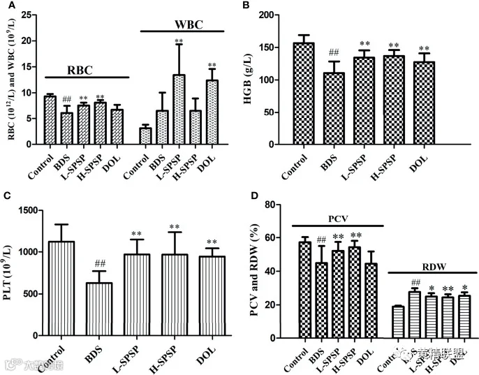 图3 BDS小鼠经不同剂量SPSP治疗后的血液参数。(A) 红细胞和白细胞数; (B) 血红蛋白(hemoglobin, HGB)含量; (C) 血小板(blood platelet, PLT)数量; (D) 红细胞压积(packed cell volume, PCV)和红细胞分布宽度(red cell volume distribution width, RDW)比率
