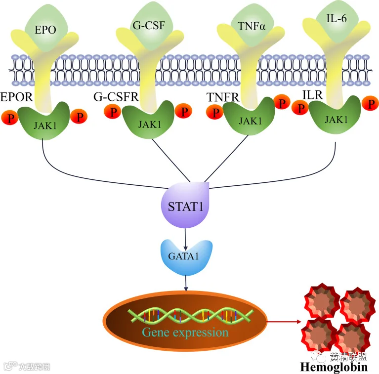图10 预测参与JAK-STAT途径的造血细胞因子(EPO、G-CSF、TNF-a和IL-6)和靶点(EPOR、JAK1、STAT1和GATA1)。