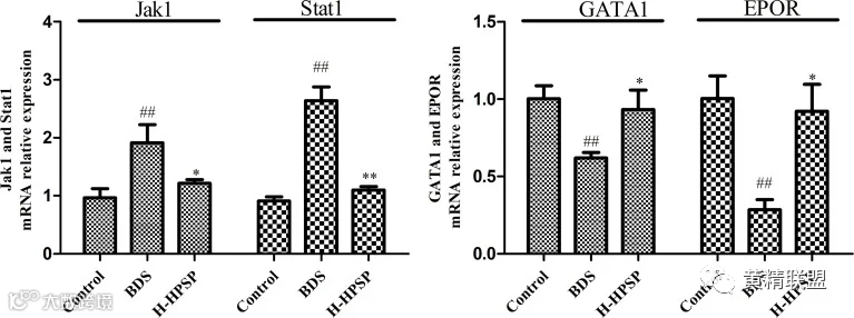 图8 H-SPSP对BDS小鼠Jak1、Stat1、EPOR和GATA1 mRNA表达的影响
