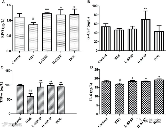 图5 SPSP对BDS小鼠造血功能(A、B)和免疫调节细胞因子(C、D)的影响。(A) 促红细胞生成素(erythropoietin, EPO)水平;(B) 粒细胞集落刺激因子(granulocyte colony stimulating factor,G-CSF)水平;(C) TNF-α水平;(D) IL-6水平