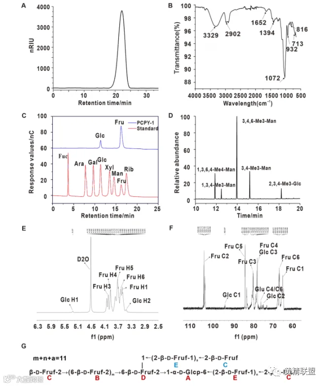首先利用高效液相色谱(HPLC)、气相色谱质谱联用(GC-MS)、核磁共振(NMR)等手段研究了黄精多糖PCPY-1的结构特点(图1)。HPLC分析表明,PCPY-1是一种均匀的多糖组分,呈单个对称峰。PCPY-1的相对分子质量和总碳水化合物含量分别为4200 Da和84.2%(图1A),由果糖和葡萄糖以摩尔比15:1组成 (图1B、C)。通过甲基化分析和核磁共振波谱对PCPY-1的一级结构进行了表征。在甲基化的PCPY-1的水解产物中观察到五种类型的醛糖醇乙酸酯(图1D)。结合单糖组成分析、甲基化和NMR光谱(图1E、F)的结果,得到了PCPY-1的主要结构(图1G)。