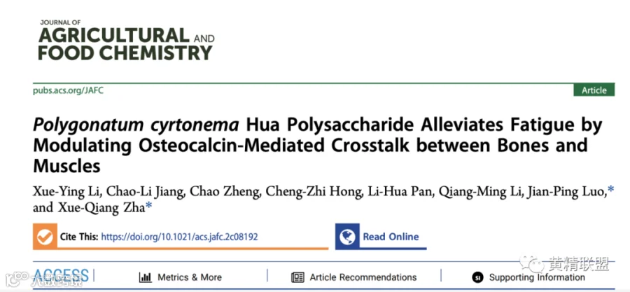 为了研究黄精多糖对骨骼和肌肉之间的生化通讯作用机制,合肥工业大学食品与生物工程学院查学强教授团队,通过解析黄精均一多糖(P. cyrtonema ,PCPY-1)结构表征,研究了其抗疲劳作用其机理。该研究通过使用游泳力竭小鼠模型和小鼠骨髓间充质干细胞/小鼠成肌细胞(BMSCs/C2C12)共培养系统,从骨钙素介导的骨骼肌通讯方面研究了PCPY-1的抗疲劳机制。研究成果在国际期刊Journal of Agricultural and Food Chemistry (Q1,IF:5.895)上发表。