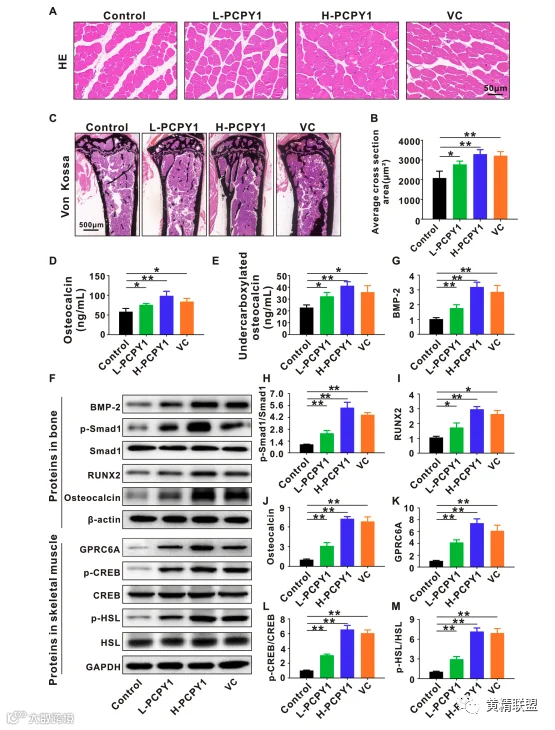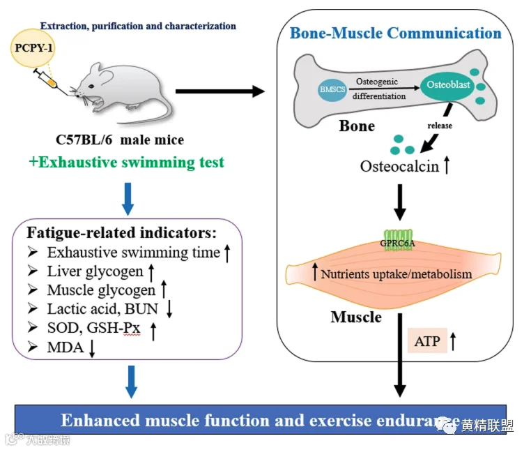 骨钙素可以调节肌肉能量代谢,从而在运动中对抗疲劳。PCPY-1可以增加骨钙素和羧化不足的骨钙素的循环水平(图6D,E),并激活GPRC6A在骨骼肌中的表达(图6F、K),从而调节葡萄糖和脂肪酸的代谢,改善骨骼肌功能和运动表现(图5和图6)。骨髓间充质干细胞是一种多能干细胞,是体内成骨细胞最重要的来源。研究进一步利用骨髓间充质干细胞探讨PCPY-1在成骨分化中的作用。研究结果表明,PCPY-1可以在体外(图2-4)和体内(图5和6)提高骨钙素水平,促进肌肉能量代谢和ATP生成,从而改善疲惫的游泳小鼠的运动表现。