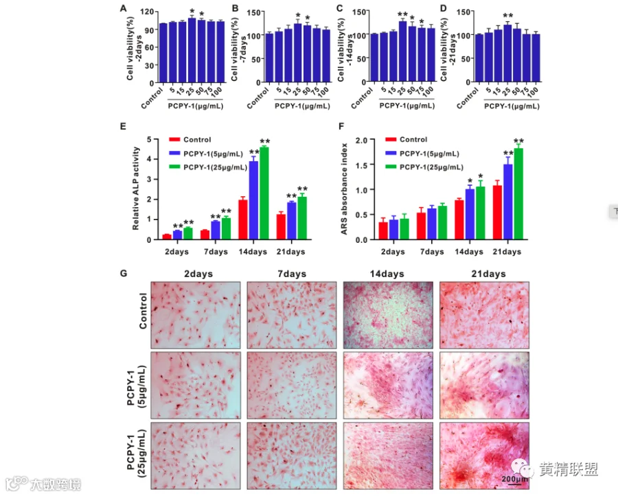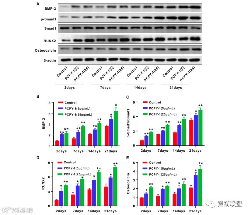 骨髓间充质干细胞的分化受到一系列信号和分子的特异性调节。BMP-2是一种众所周知的诱导生长因子,可以刺激多种干细胞的成骨分化和矿化,下游转录因子Smad1和RUNX2是至关重要的BMP-2的细胞内效应物。在分化2、7、14和21天后,与对照组相比,PCPY-1显著上调BMSC中BMP-2、p-Smad1、RUNX2和骨钙素蛋白的水平(图3A-E)。进一步推断PCPY-1可能是促进BMSCs向成骨细胞分化的有效途径。