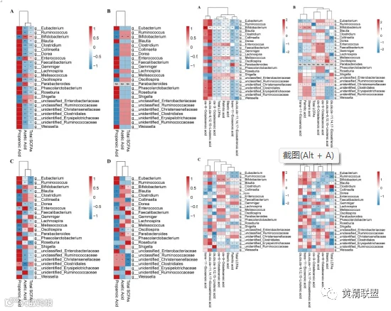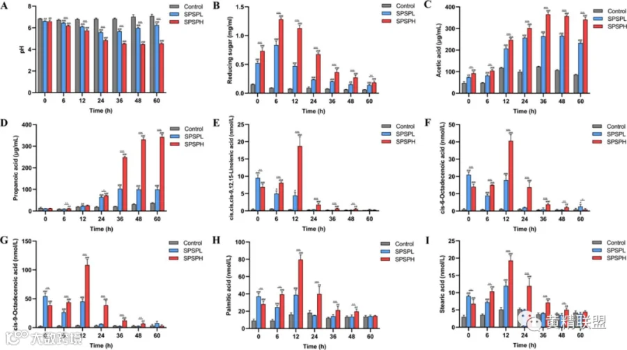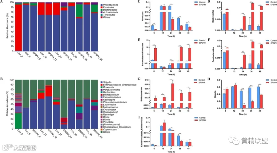 该研究中,通过体外发酵法,作者系统探究了蒸制黄精多糖(SPSP)对脂肪酸和肠道微生物的作用。首先,作者测定了SPSP对发酵过程中pH和还原糖的影响(直接表示产酸量和碳水化合物消耗量,反映SPSP的微生物活性)。结果显示,通过体外粪便发酵后pH值显著降低,还原糖含量先升高后下降。其次,SPSP对调节短链脂肪酸和长链脂肪酸生成的起到重要作用:12小时后,乙酸和丙酸等短链脂肪酸和cis, cis, cis-9,12,15-亚麻酸、cis-6-十八烯酸和cis-9-十八烯酸等长链脂肪酸的含量显著增加。在此过程中特定有益微生物群随之增加,如拟杆菌和双歧杆菌,而有害微生物群减少,如志贺杆菌。同时,进一步的分析表明,双歧杆菌的丰度与短链脂肪酸、长链脂肪酸的含量以及拟杆菌类的实际作用有着重要的相关性。
