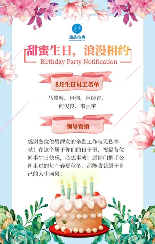 8月是一个浪漫的季节,为了表达对本月寿星的无限宠爱,让寿星宝宝们度过一个甜蜜、浪漫的生日,公司特意将本月的生日会安排在了冒着粉红泡泡的七夕佳节。甜蜜的日子里,大家一道过节,一同畅玩,一起狂欢!