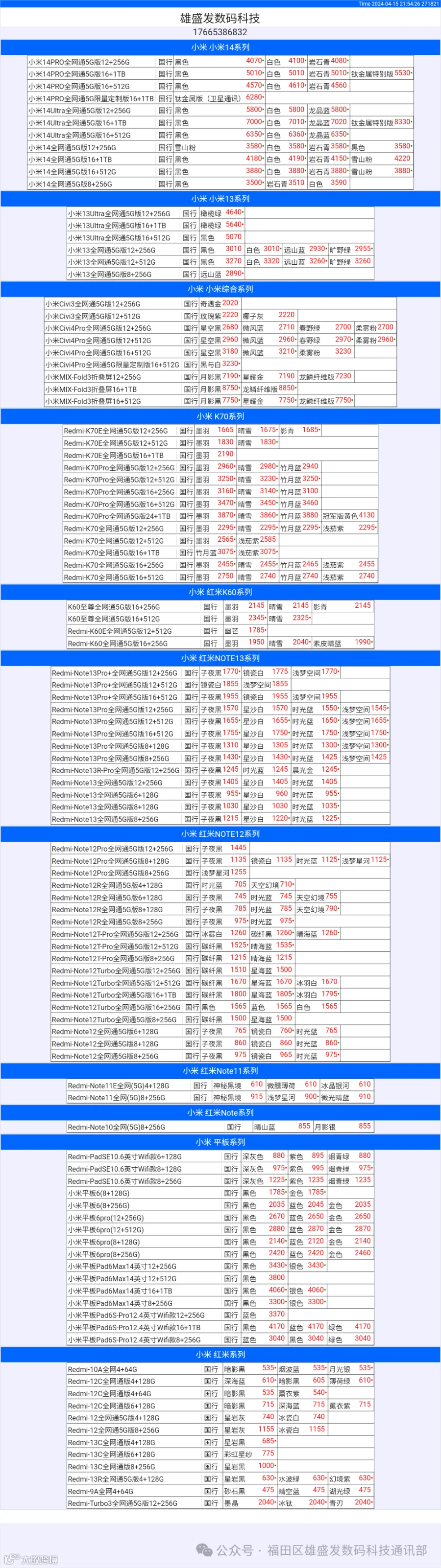 新机报价【2024年4月15日】小米  红米   黑鲨   报价 芯烨微 电子科技