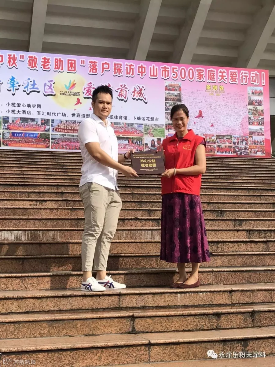 上图为“永涂乐”李文浩副总经理代表公司接受“热心公益,敬老助困”纪念牌匾