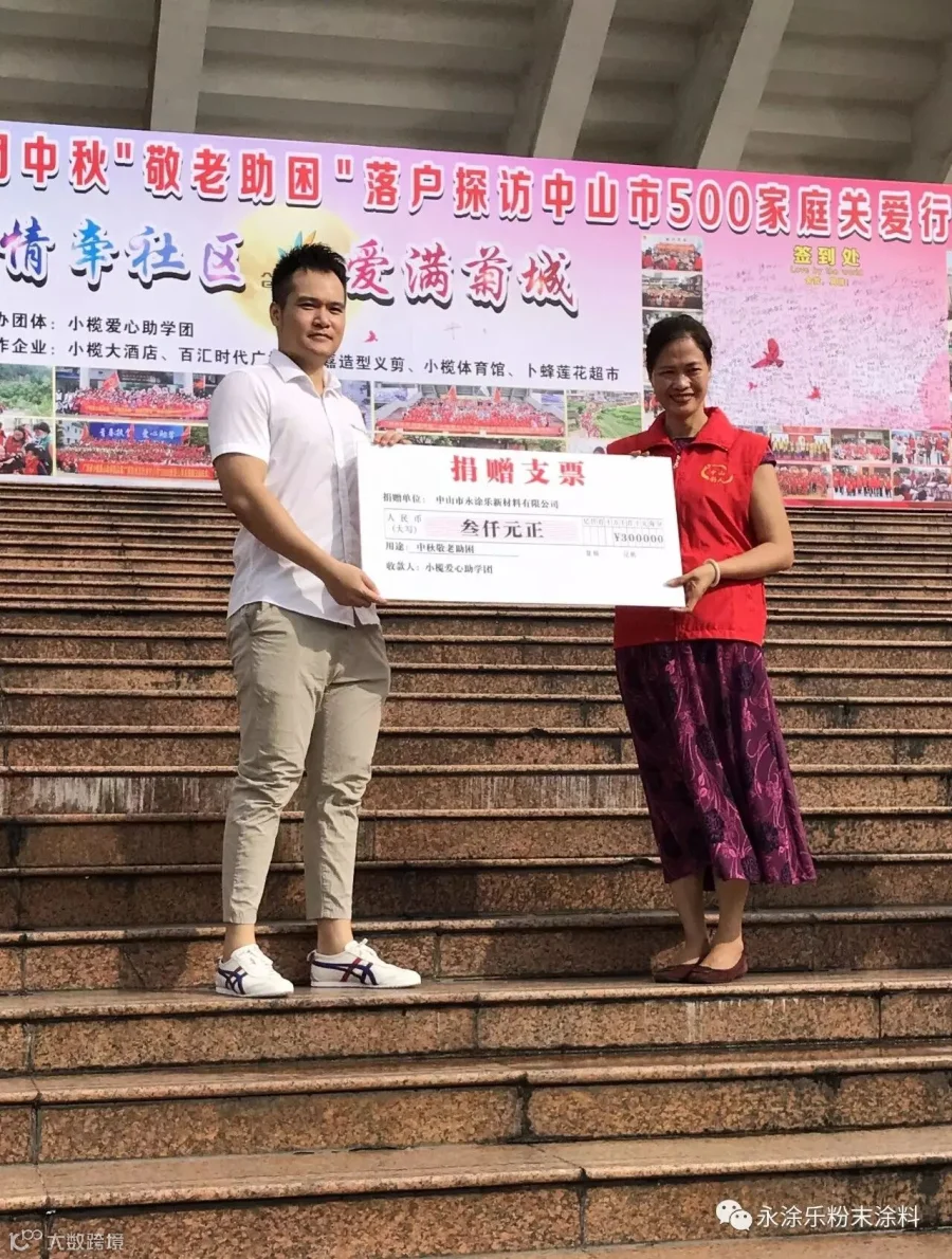 上图为“永涂乐”李文浩副总经理代表公司为小榄爱心助学团捐赠支票