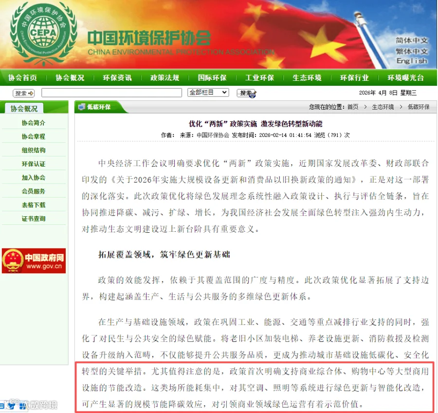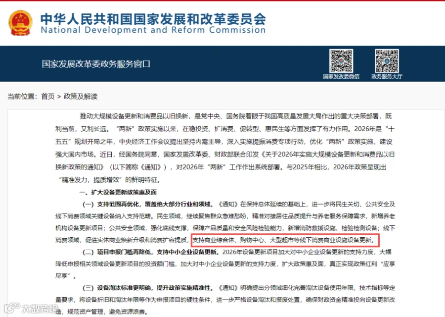 2026年“两新”政策首次将商业综合体、购物中心、百货店、大型超市等线下消费商业设施的设备更新纳入支持范围。