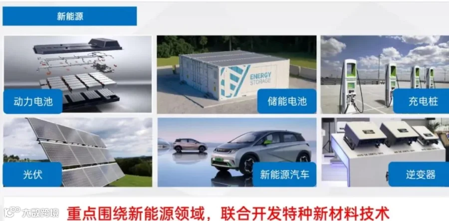 会议中双方确定了重点围绕新能源动力电池、储能电池充电桩 、光伏 、新能源汽车、逆变器等新能源领域,联合开发特种新材料技术