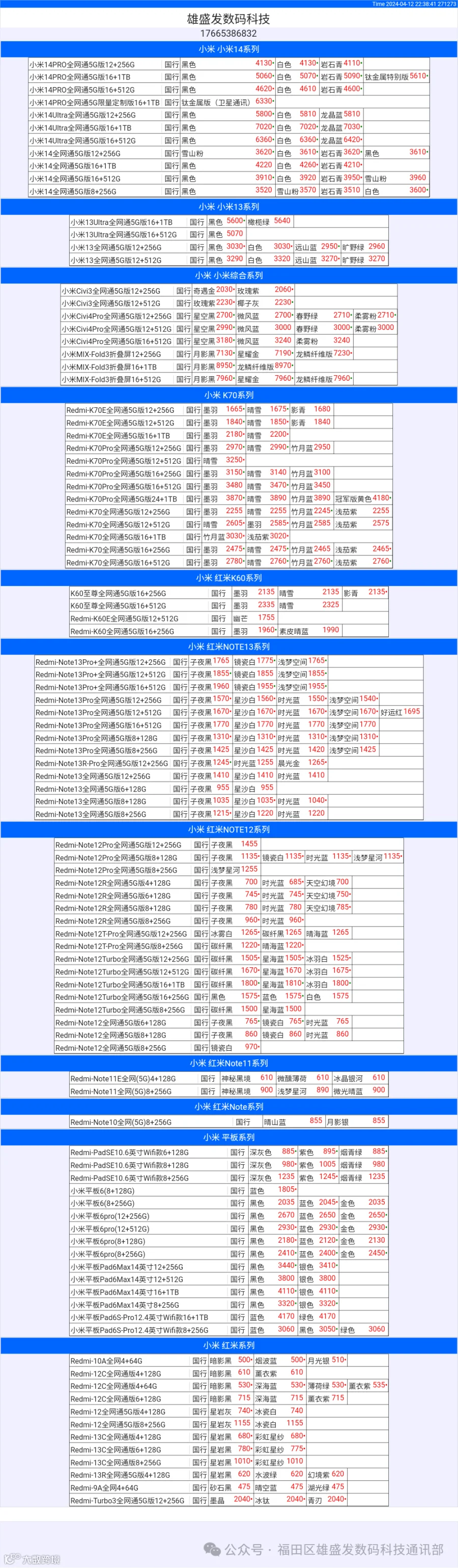新机报价【2024年4月12日】小米  红米   黑鲨   报价 芯烨微 电子科技