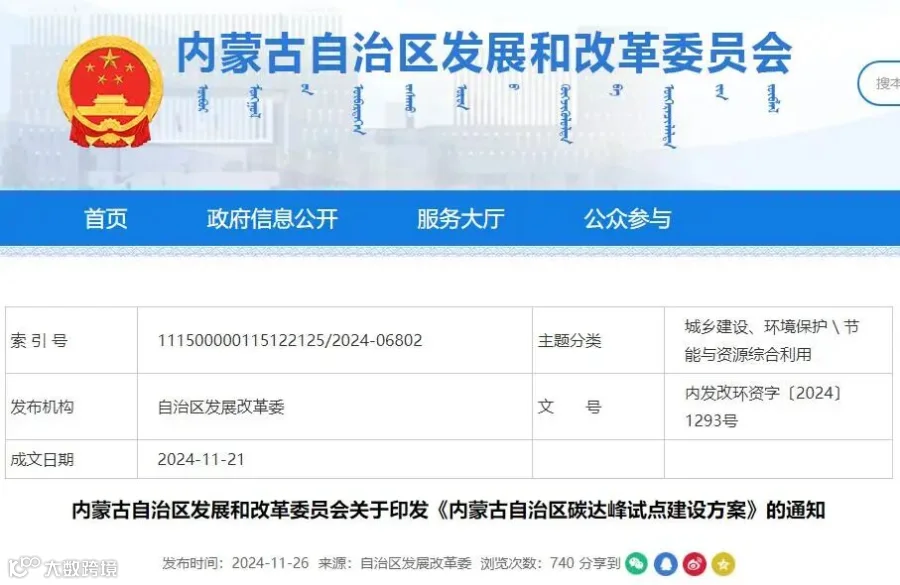 就以内蒙古自治区为例,11月21日,当地发改委印发了《内蒙古自治区碳达峰试点建设方案》(以下简称:建设方案)。