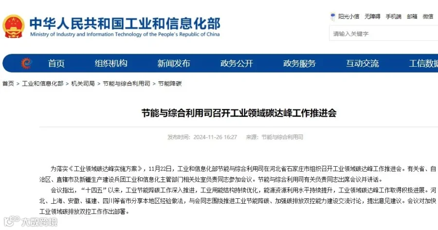 11月22日,工业和信息化部节能与综合利用司组织召开了工业领域碳达峰工作推进会。