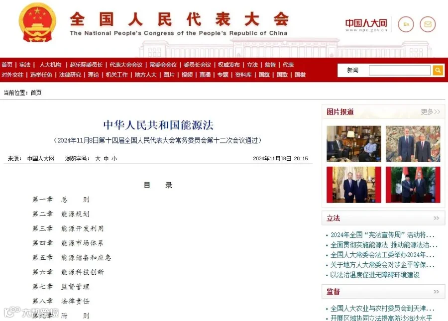 11月8日,十四届全国人大常委会第十二次会议表决通过《中华人民共和国能源法》(以下简称《能源法》),该法自2025年月1日起施行。