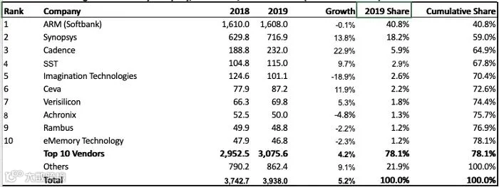 根据该表格显示,2019年全球半导体IP核市场总价值约为39.4亿美元,比2018年的37.4亿美元增长了5.2%。考虑到半导体市场在2019年下降了约15%,且IP核特许权使用费通常与芯片销售价格挂钩,这份榜单正好说明IP核在半导体市场的渗透率进一步提高了。