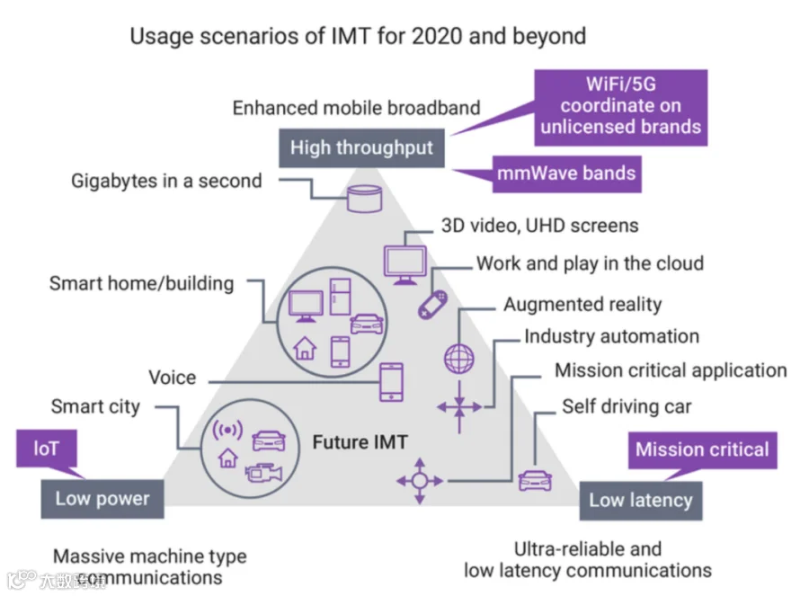相比于4G,5G的业务场景扩大,业务需求发生重大变化。5G具有大带宽、低延时、广联接的特性,这为整个行业带来了颠覆性的新应用机会。