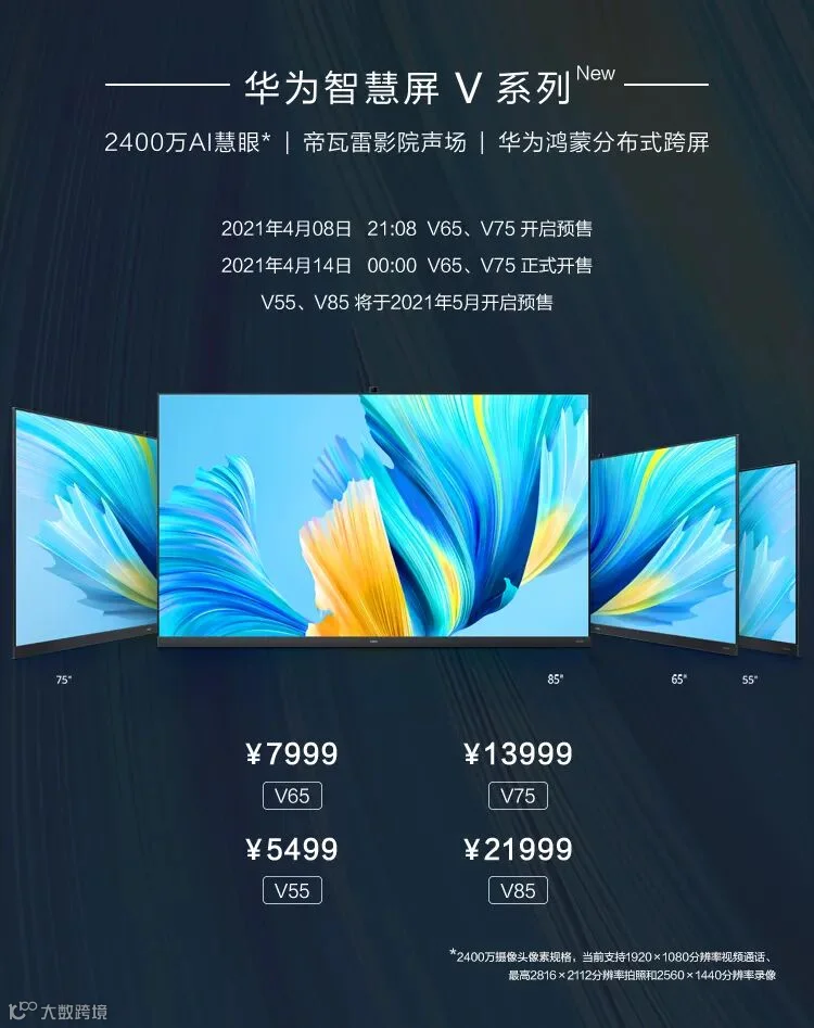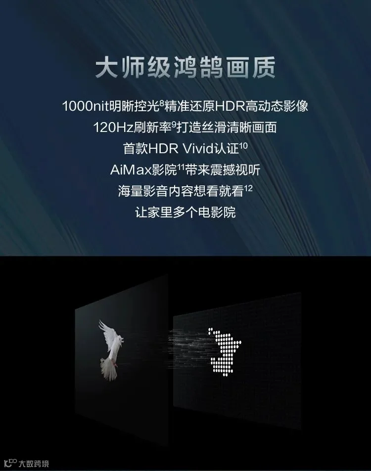 8.1000 nit 为 65、75、85 英寸机型的峰值亮度,55 英寸的峰值亮度为 750 nit。测试结果来源于华为实验室。