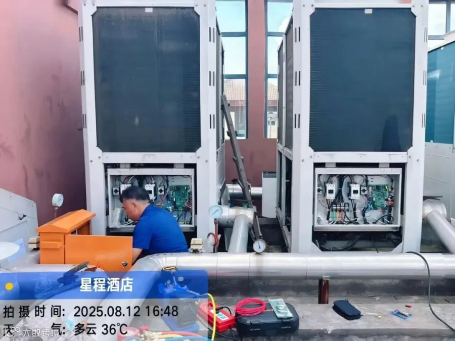 ▲株洲市星程酒店空调节能改造打样现场,机型:美的牌风冷热泵模块机组,节能率49%
