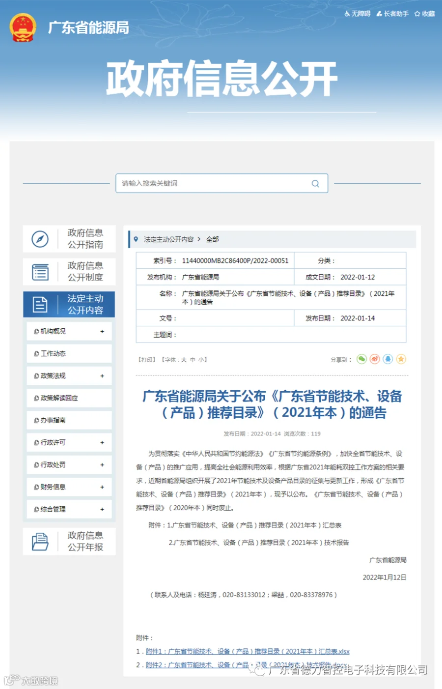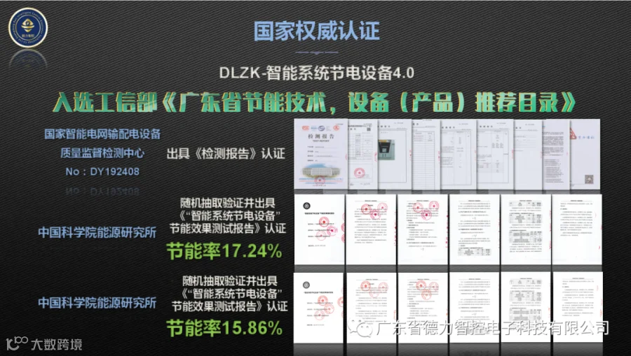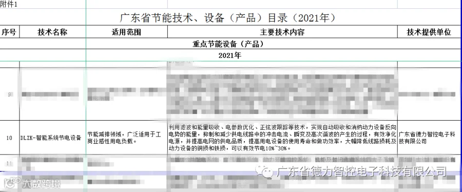 在正式公布的《 广东省节能技术、设备(产品)目录》(2021年本)中,我司专利产品“DLZK-智能系统节电设备”在“重点节能设备(产品)2021年的第10位,其中也体现出我司产品的节能效果达10%~30%。