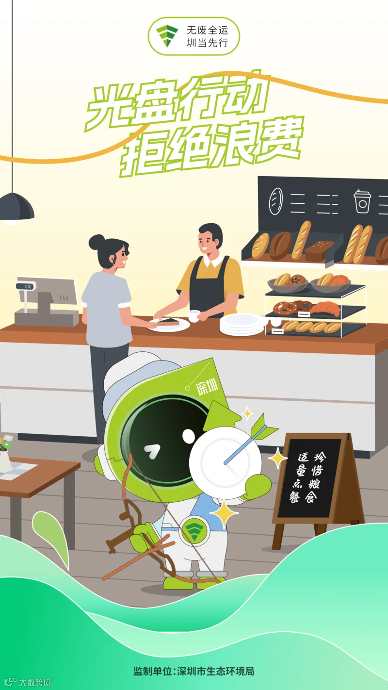 海报以“深无废”IP为主题形象,“深无废”绿色智能机器人在“无废”场景中亲身体验竞赛项目,助力深圳“无废城市”建设。海报上,“深无废”化身运动员,体验深圳赛区七种竞赛项目(羽毛球、射箭、篮球、自行车、艺术体操、马术、田径),呈现出“光盘行动,拒绝浪费”“绿色消费,理性购物”“绿色出行,低碳同行”“绿色包装,减废减塑”“垃圾分类,无废观赛”“惜物减废,循环利用”“共赴美丽全运,共建无废社会”七大主题海报。