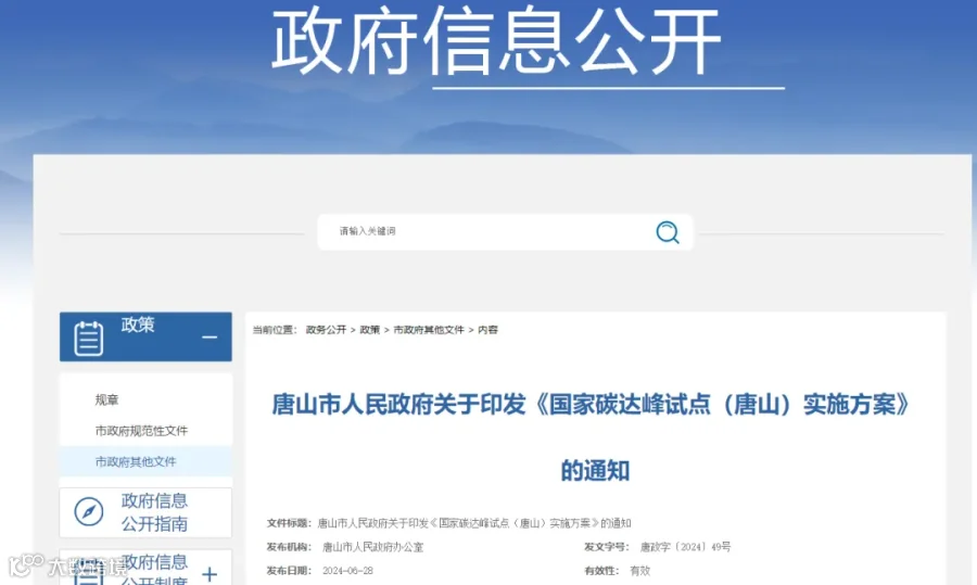 6月28日,唐山市人民政府印发《国家碳达峰试点(唐山)实施方案》(唐政字〔2024〕49号)。总体目标:到2025年,唐山市碳达峰试点城市工作取得积极进展,非化石能源消费比重达到4%以上,单位地区生产总值能耗、二氧化碳排放完成省下达目标,在钢铁产业低碳转型、能源与资源利用、能源绿色低碳转型等领域初步形成一批可操作、可复制、可推广的创新举措和改革经验,初步构建有利于绿色低碳发展的政策机制,对全国老工业城市碳达峰工作的示范引领作用初步显现。