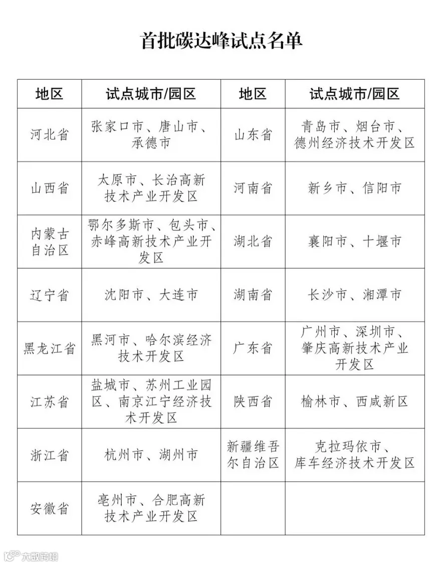 2023年11月,国家发展改革委办公厅印发首批碳达峰试点名单,确定张家口市等25个城市、长治高新技术产业开发区等10个园区为首批碳达峰试点城市和园区;要求各试点城市和园区要按照《国家碳达峰试点建设方案》及《碳达峰试点实施方案编制指南》部署要求,结合自身实际科学编制试点实施方案。