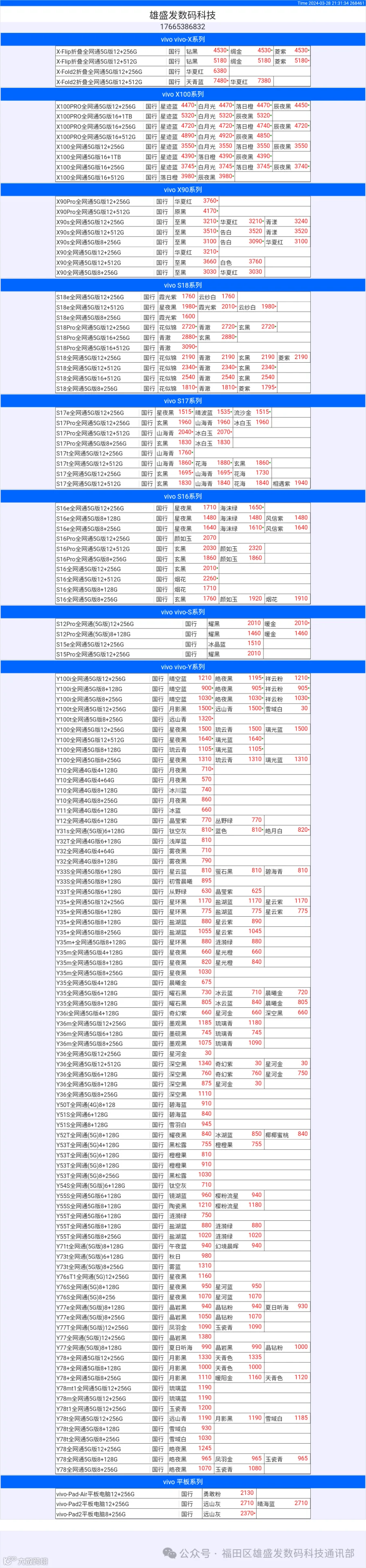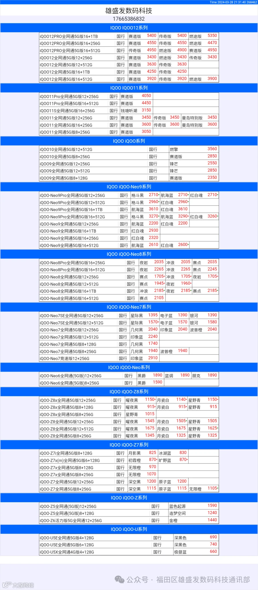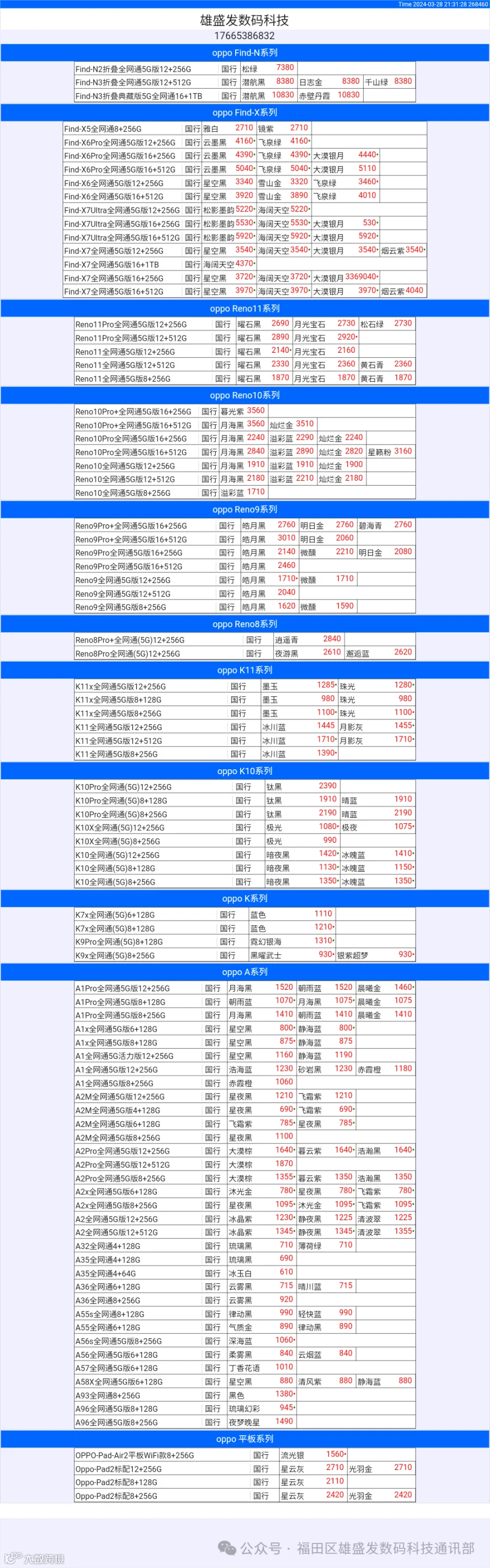 新机报价【2024年3月28日】OPPO   VIVO  IQOO   一加   真我 芯烨微 电子科技