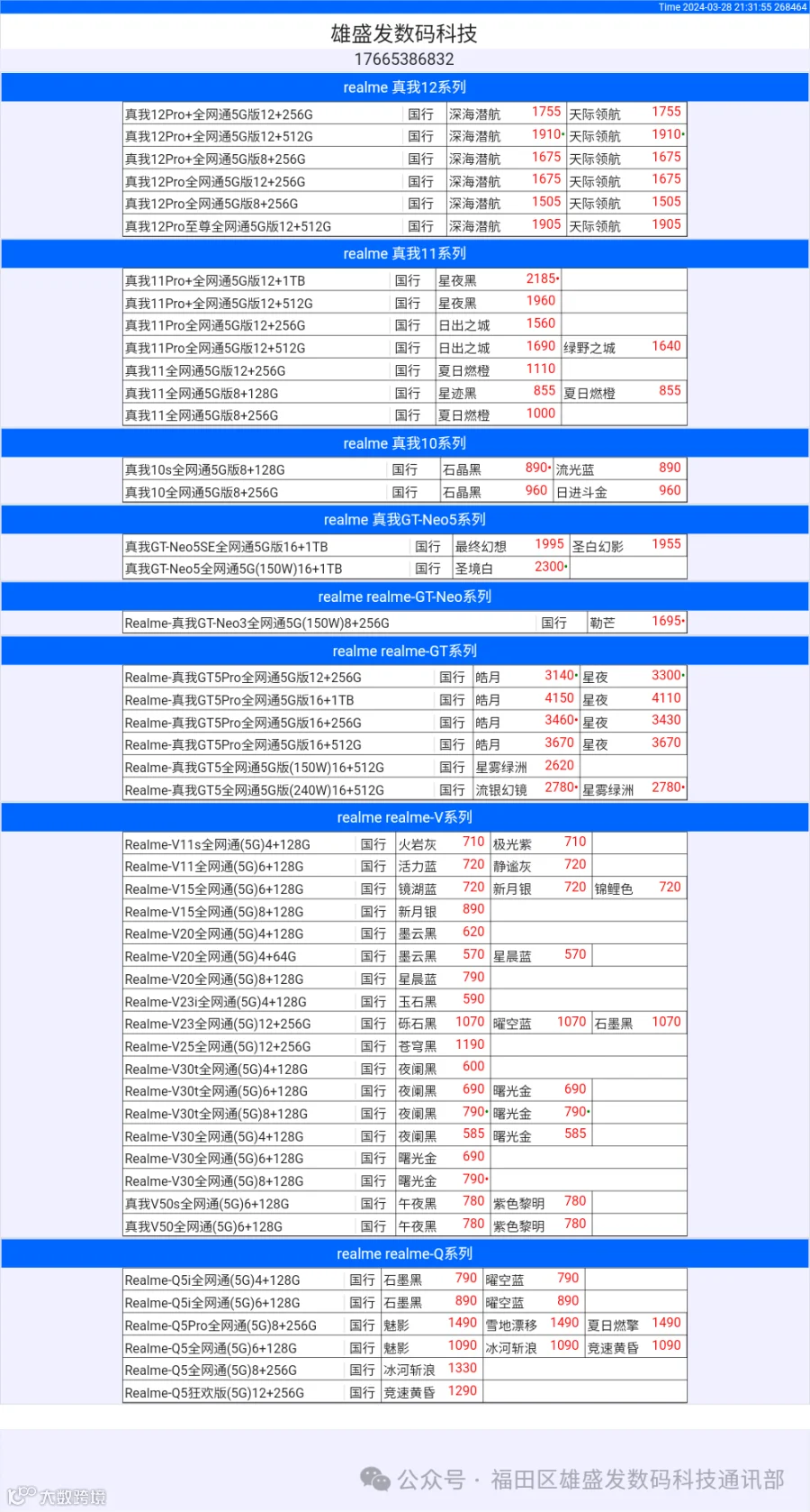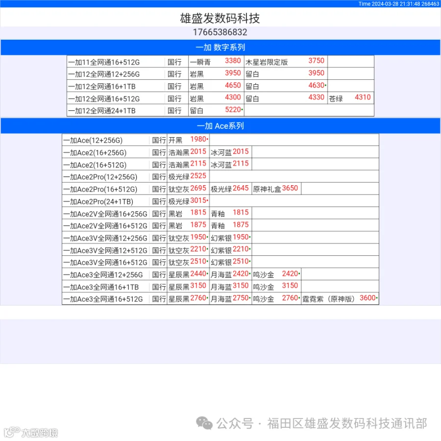 新机报价【2024年3月28日】OPPO VIVO IQOO 一加 真我