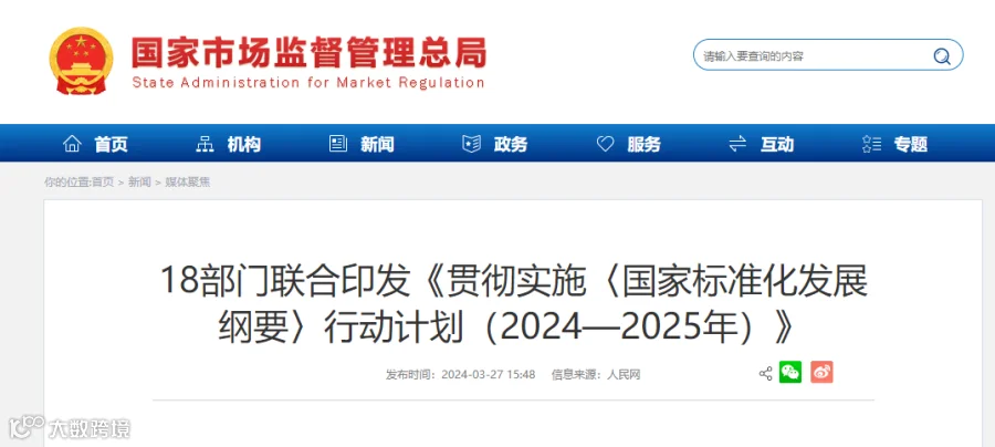 3月18日,市场监管总局会同中央网信办、国家发展改革委等18部门联合印发《贯彻实施〈国家标准化发展纲要〉行动计划(2024—2025年)》(以下简称《行动计划》),就2024年至2025年贯彻实施《国家标准化发展纲要》(以下简称《纲要》)提出具体任务,要求各地区各部门结合实际认真贯彻落实。