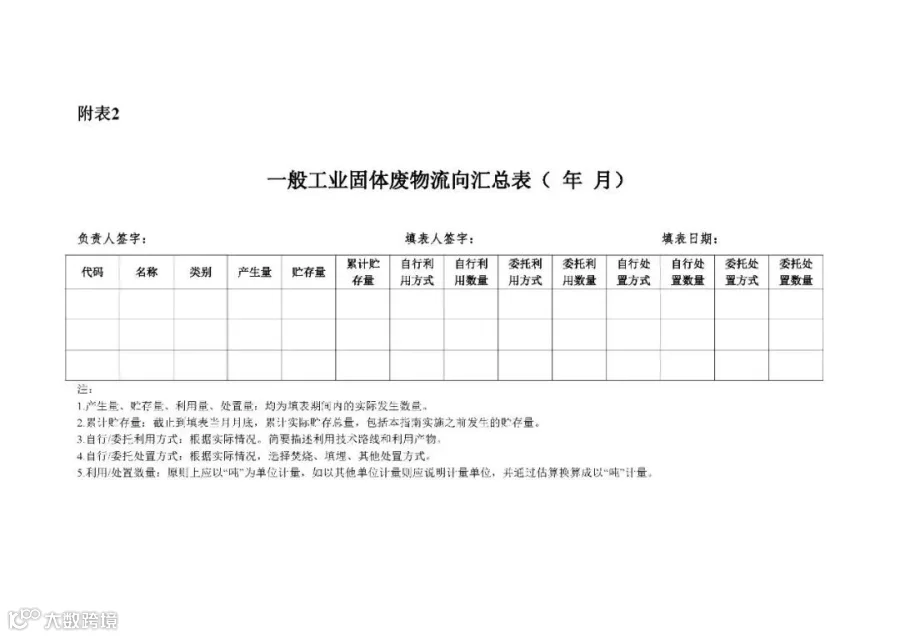 附表 2 按月填写,记录固体废物的产生、贮存、利用、处置数量和利用、处置方式等信息;