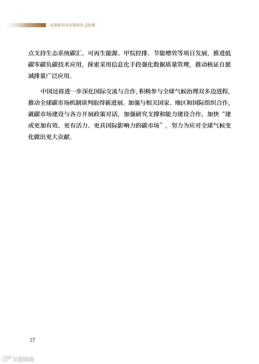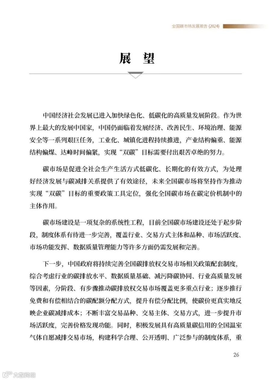 《报告》提到,下一步,中国政府将持续完善全国碳排放权交易市场相关政策配套制度,综合考虑行业的碳排放水平、数据质量基础、减污降碳协同、行业高质量发展等因素,分阶段、有步骤推动碳排放权交易市场覆盖更多重点行业;逐步推行免费和有偿相结合的碳配额分配方式,提升有偿分配比例,使碳价更真实地反映企业碳减排成本;不断丰富交易品种、交易主体、交易方式,进一步提升市场活跃度,完善价格发现功能。同时,积极发展具有高质量碳信用的全国温室气体自愿减排交易市场,构建科学合理、公开透明、广泛参与的制度体系,重点支持生态系统碳汇、可再生能源、甲烷控排、节能增效等项目发展,推进低碳零碳负碳技术应用,探索采用信息化手段强化数据质量管理,推动核证自愿减排量广泛应用。