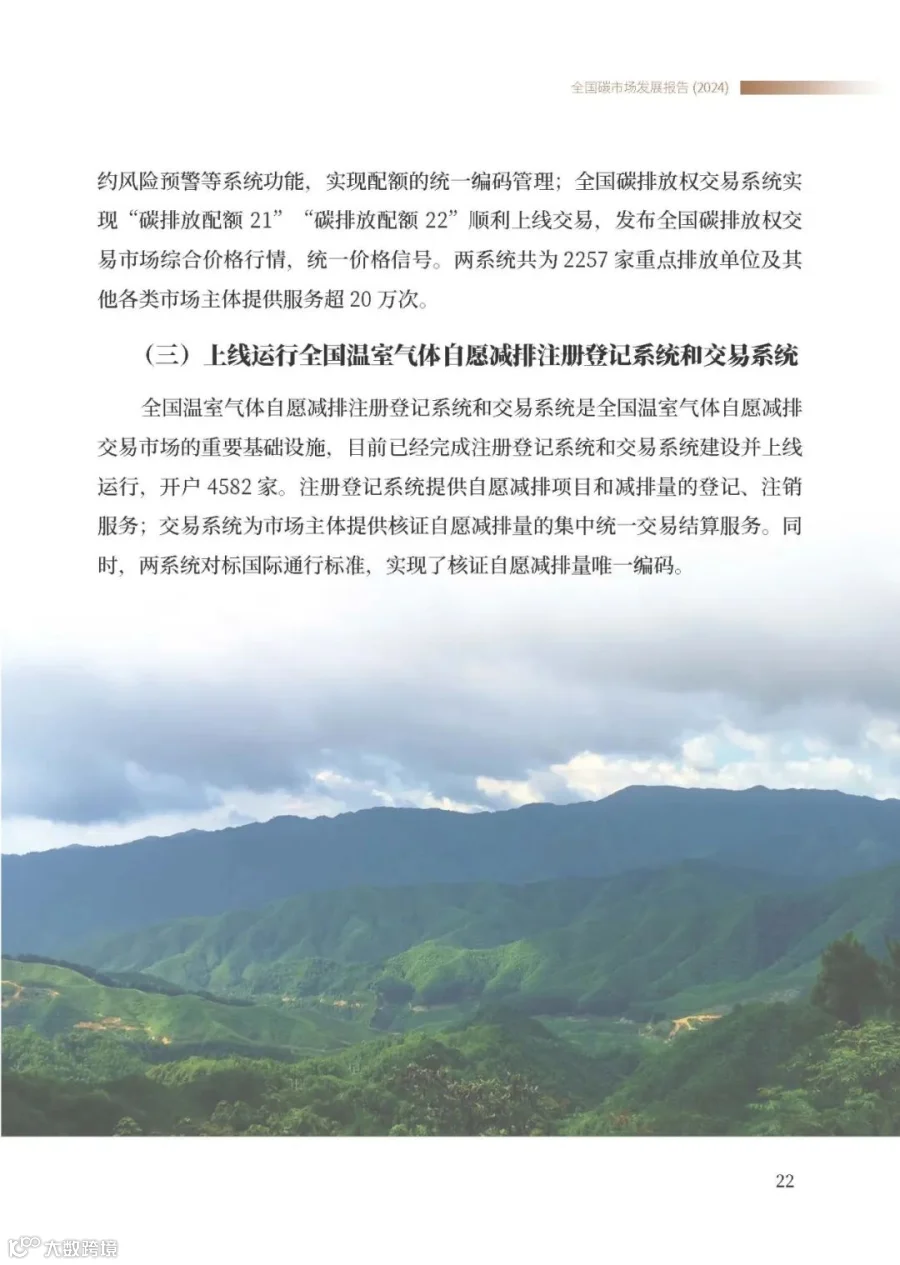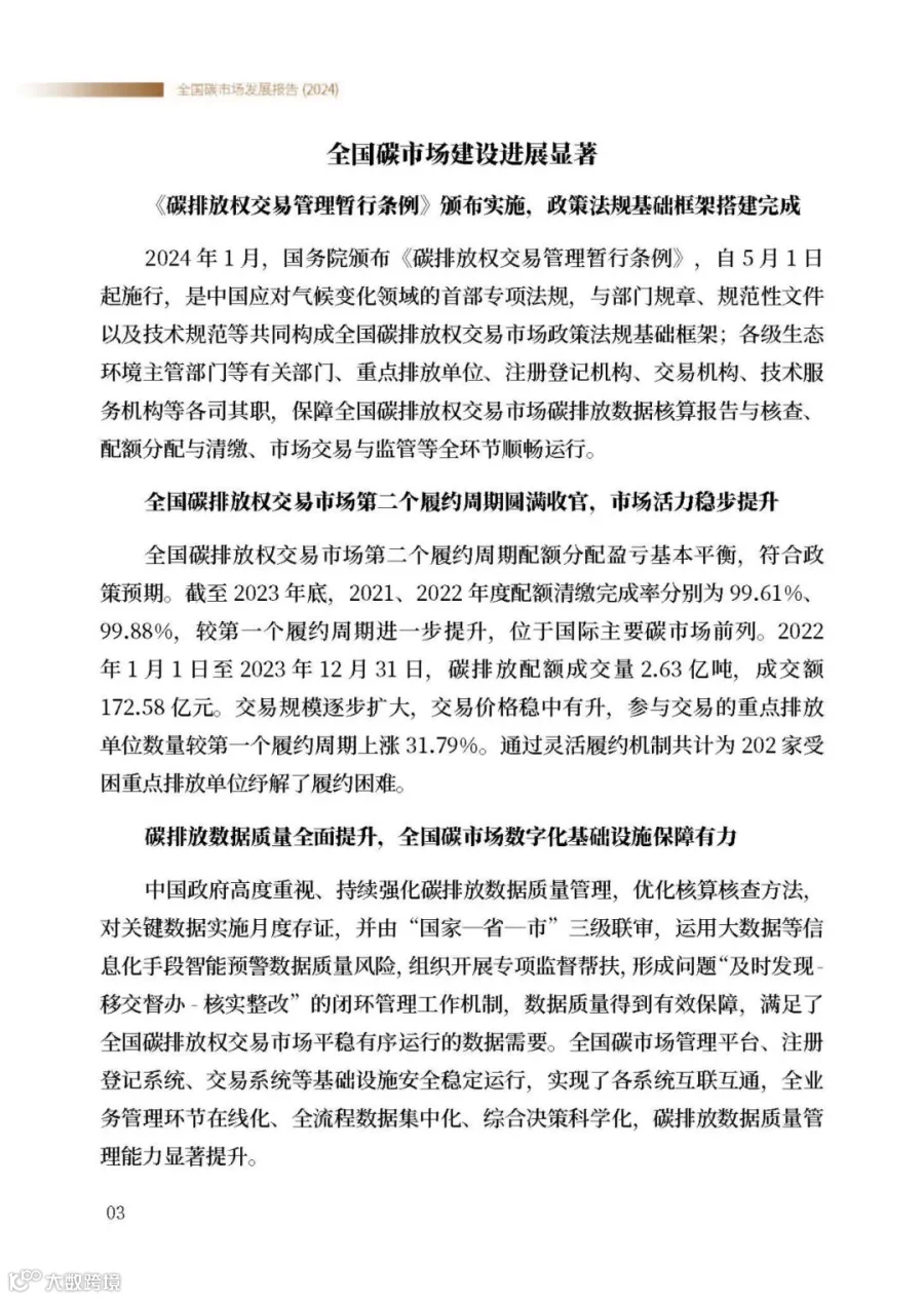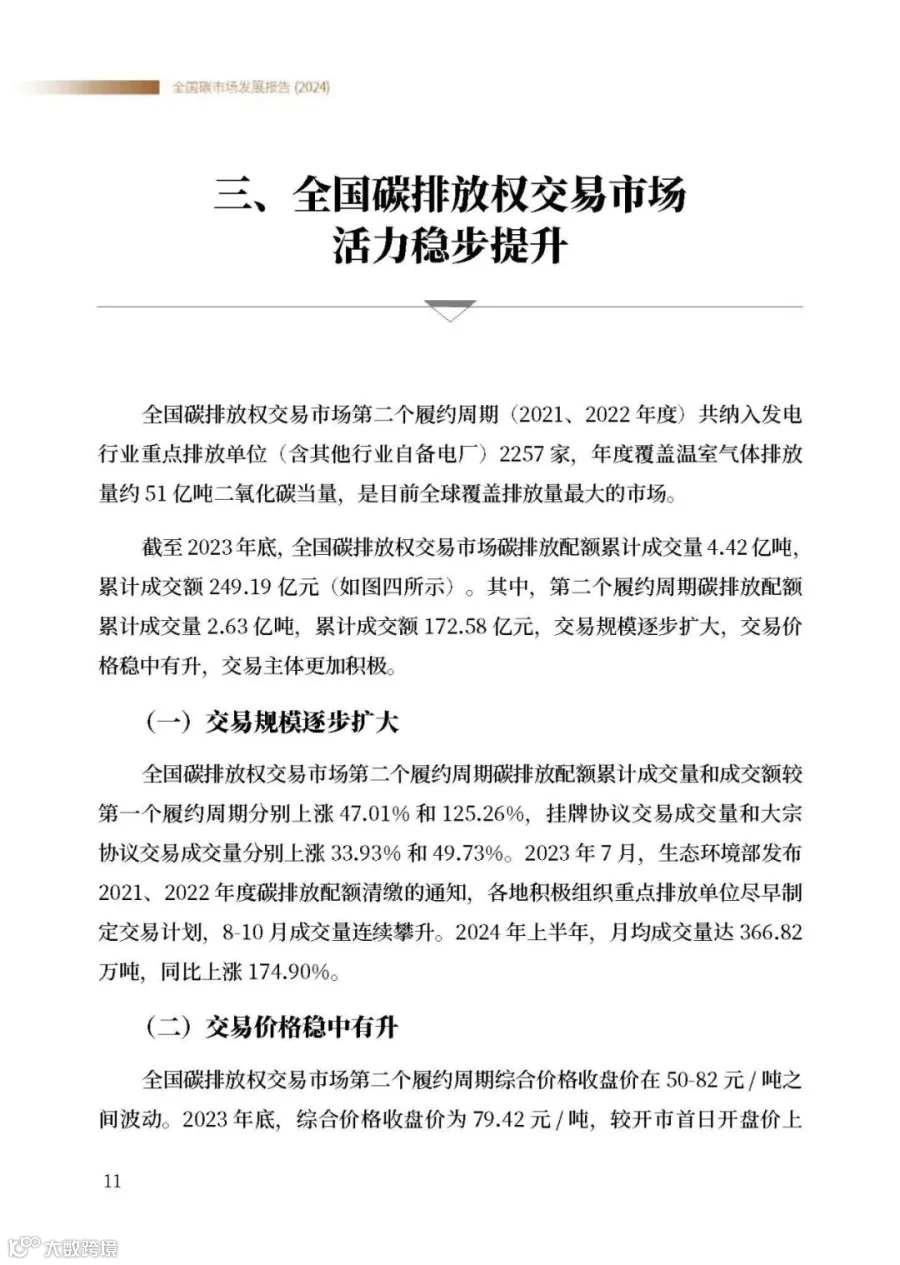 《报告》系统总结了全国碳排放权交易市场和全国温室气体自愿减排交易市场的最新建设进展,全方位展示了市场建设运行工作成效,展望了全国碳市场未来发展方向,是继2022年《全国碳排放权交易市场第一个履约周期报告》之后,生态环境部发布的全国碳市场最新进展情况报告。