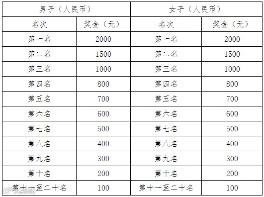 注:此奖项仅奖励瑞金籍市民(以居民户口簿、身份证、居住证、社保卡等有效证件为准,报名时需上传资料图片),男子、女子各录取前二十名选手,组委会将根据选手报名时提供的有效信息筛选比赛名次。