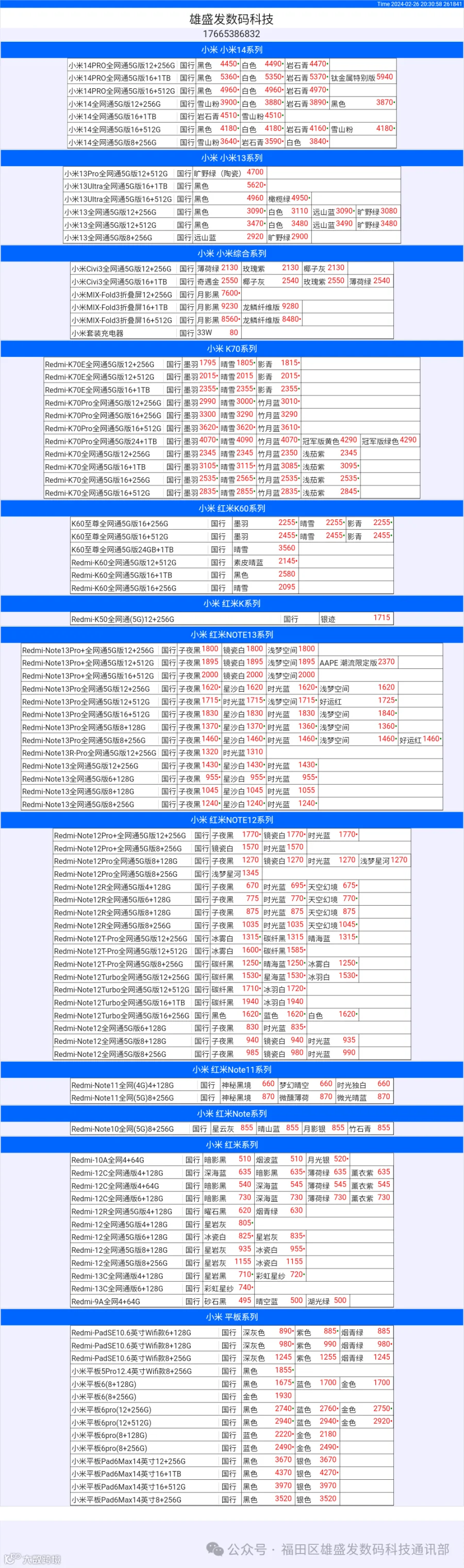 新机报价【2024年2月26日】小米  红米   黑鲨   报价 芯烨微 电子科技