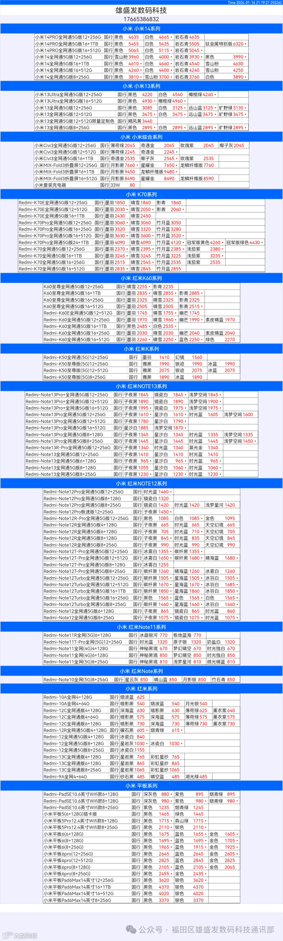 新机报价【2024年1月16日】小米  红米   黑鲨   报价 芯烨微 电子科技