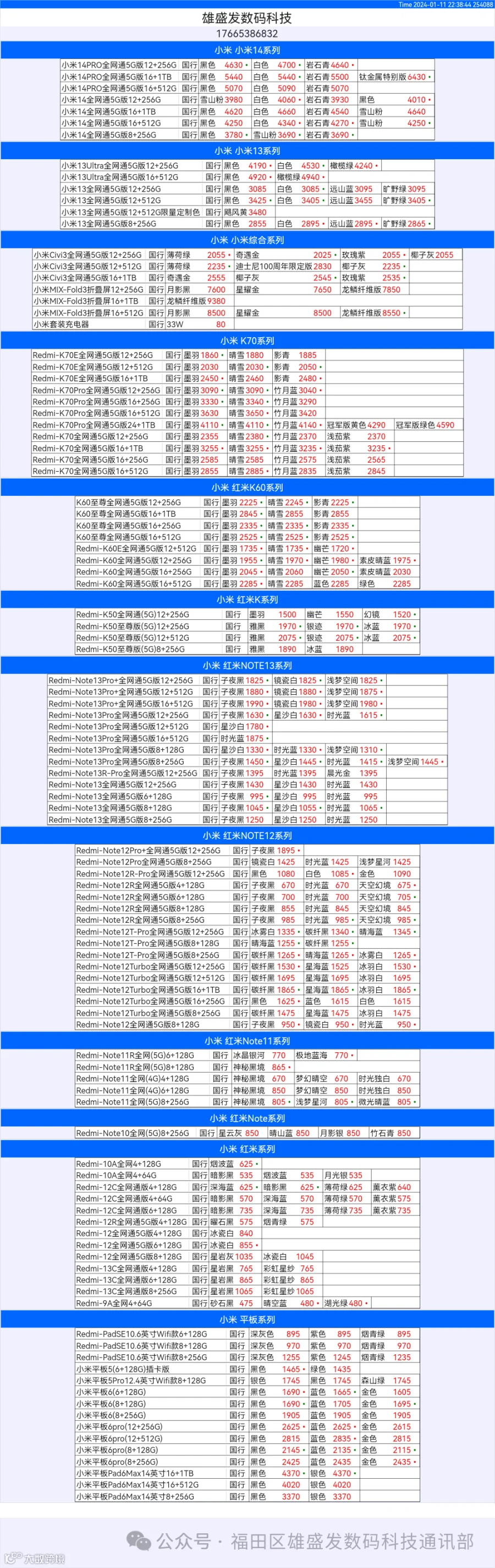 新机报价【2024年1月11日】小米  红米   黑鲨   报价 芯烨微 电子科技