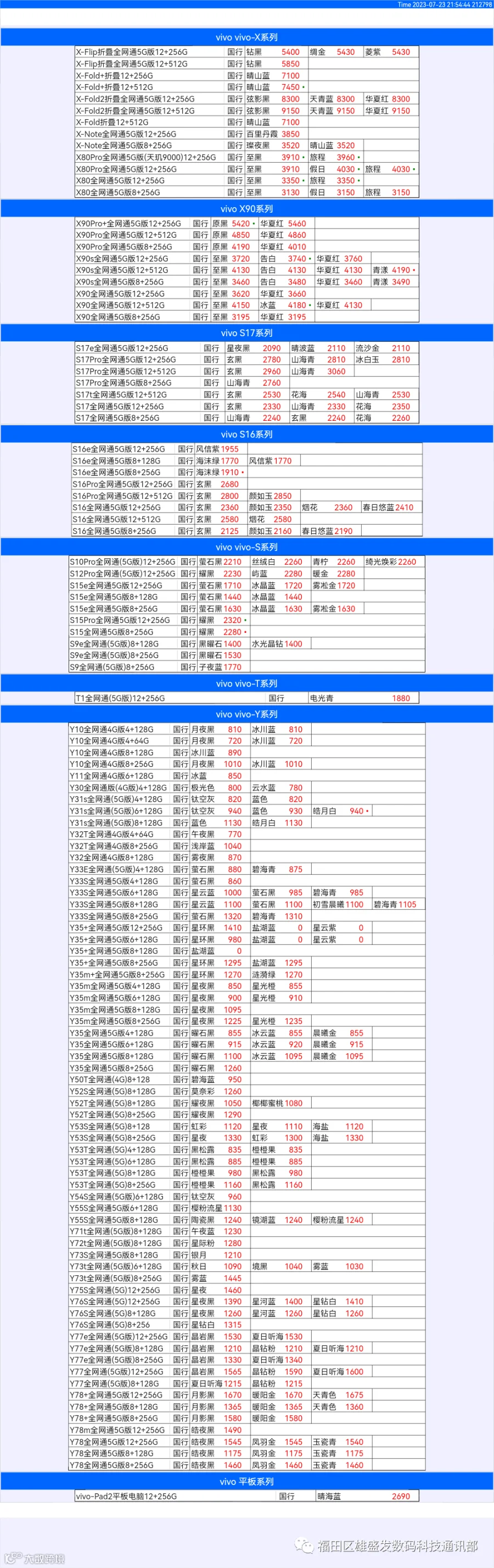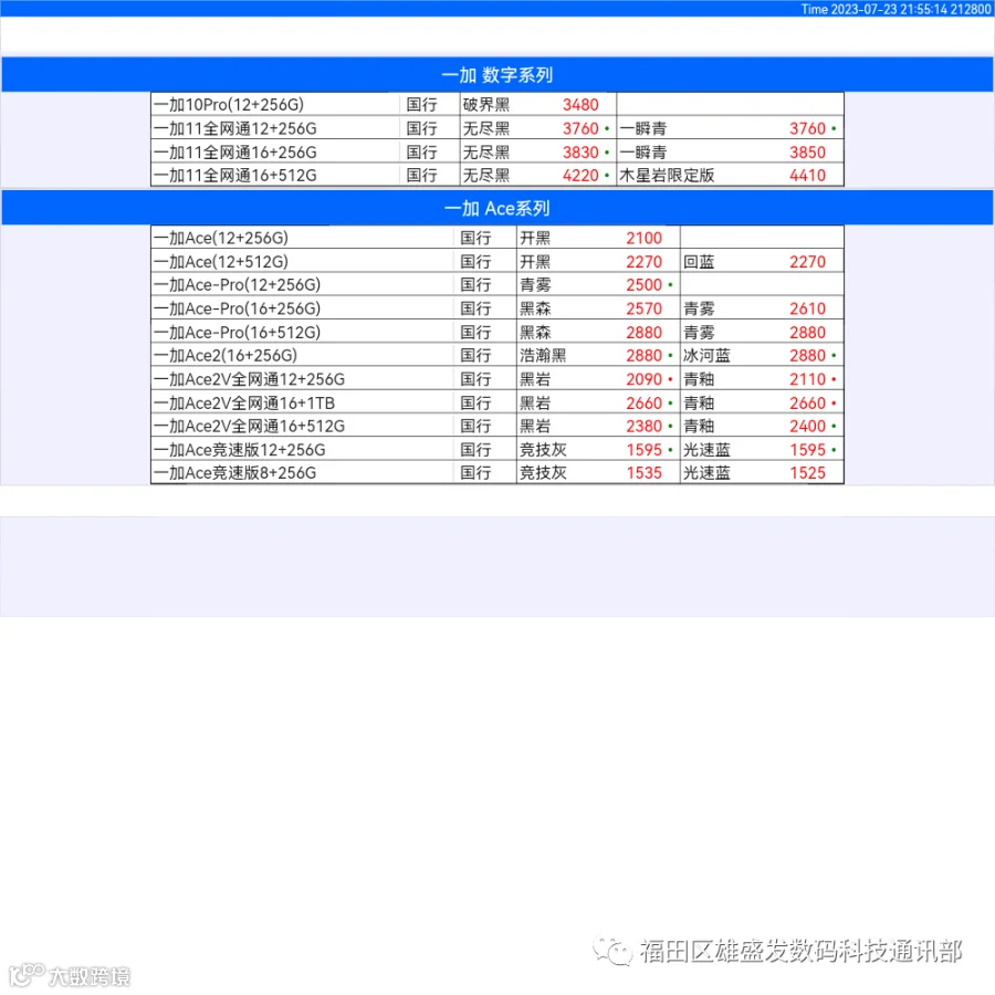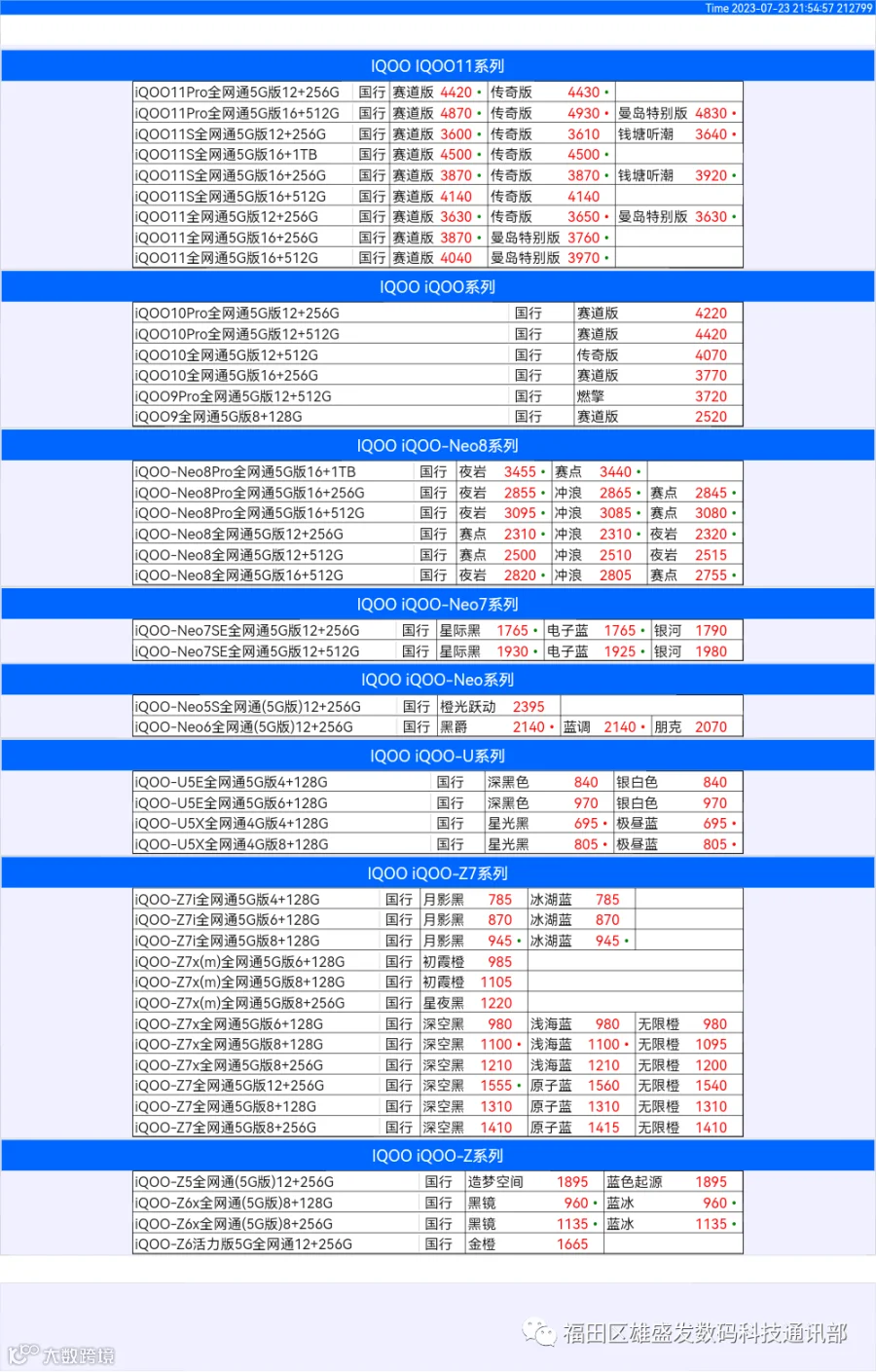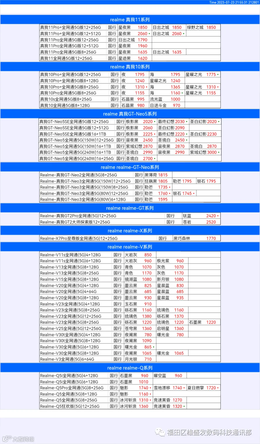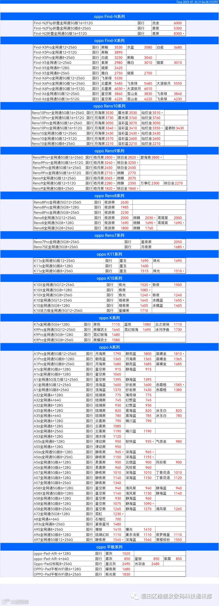 新机报价【2023年7月23日】OPPO   VIVO  IQOO   一加   真我 芯烨微 电子科技