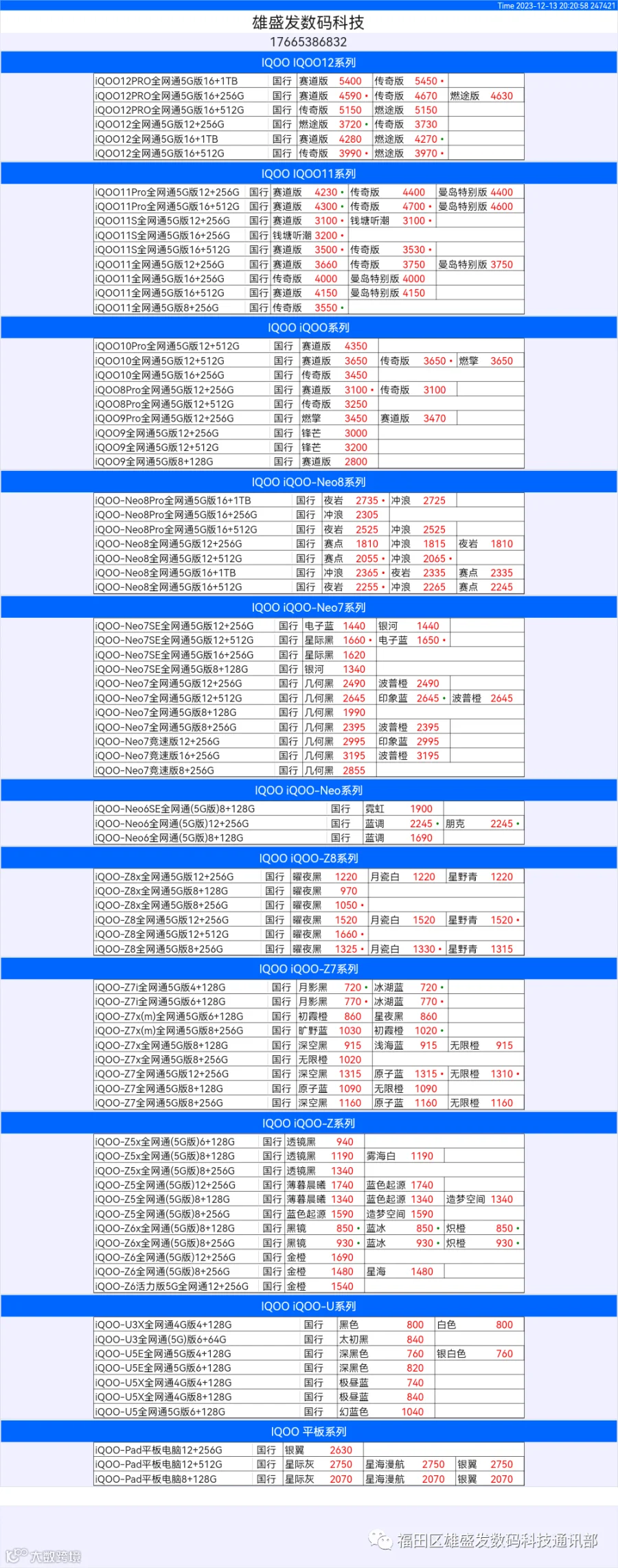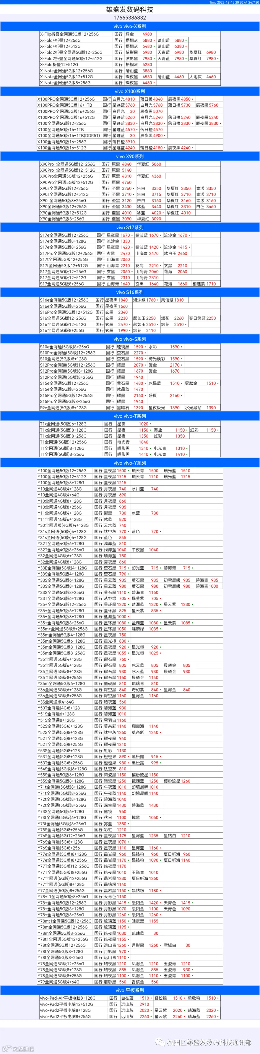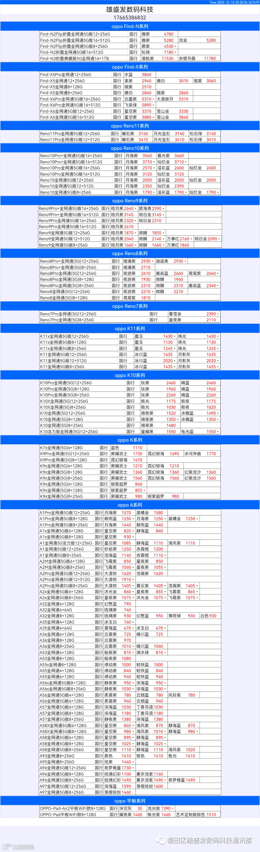 新机报价【2023年12月13日】OPPO   VIVO  IQOO   一加   真我 芯烨微 电子科技